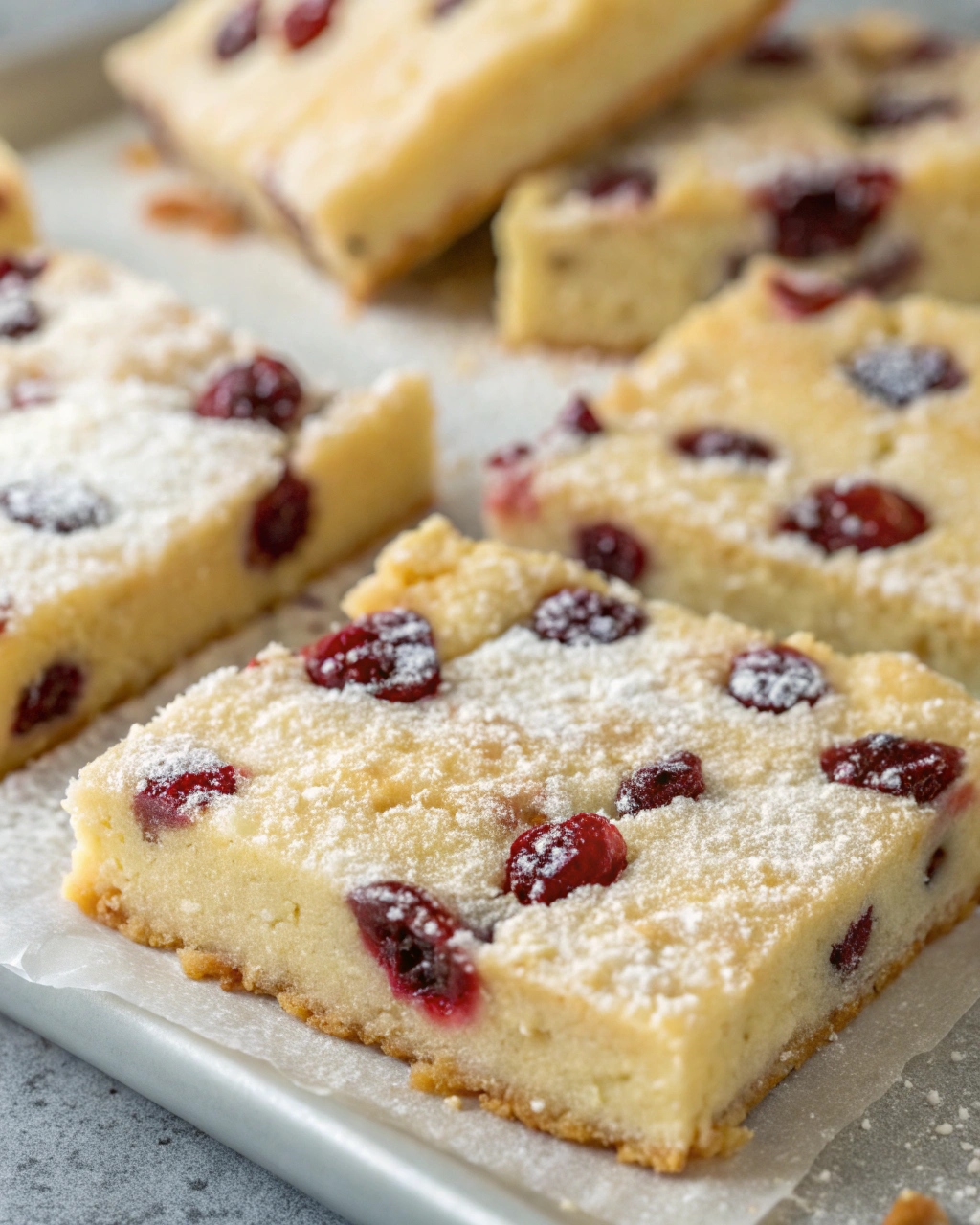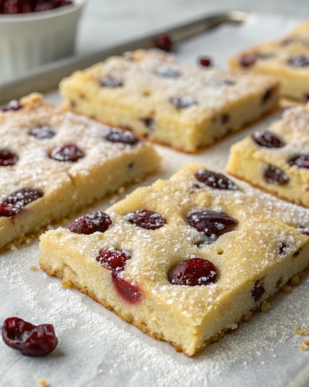 Sugared Cranberry Shortbread Bars combine rich, buttery shortbread with tart-sweet, dried cranberries and a sparkling sugar topping. Baked until lightly golden and sliced into soft, crumbly bars, this treat is perfect for holidays, cookie exchanges, or anytime you want a simple, elegant dessert.