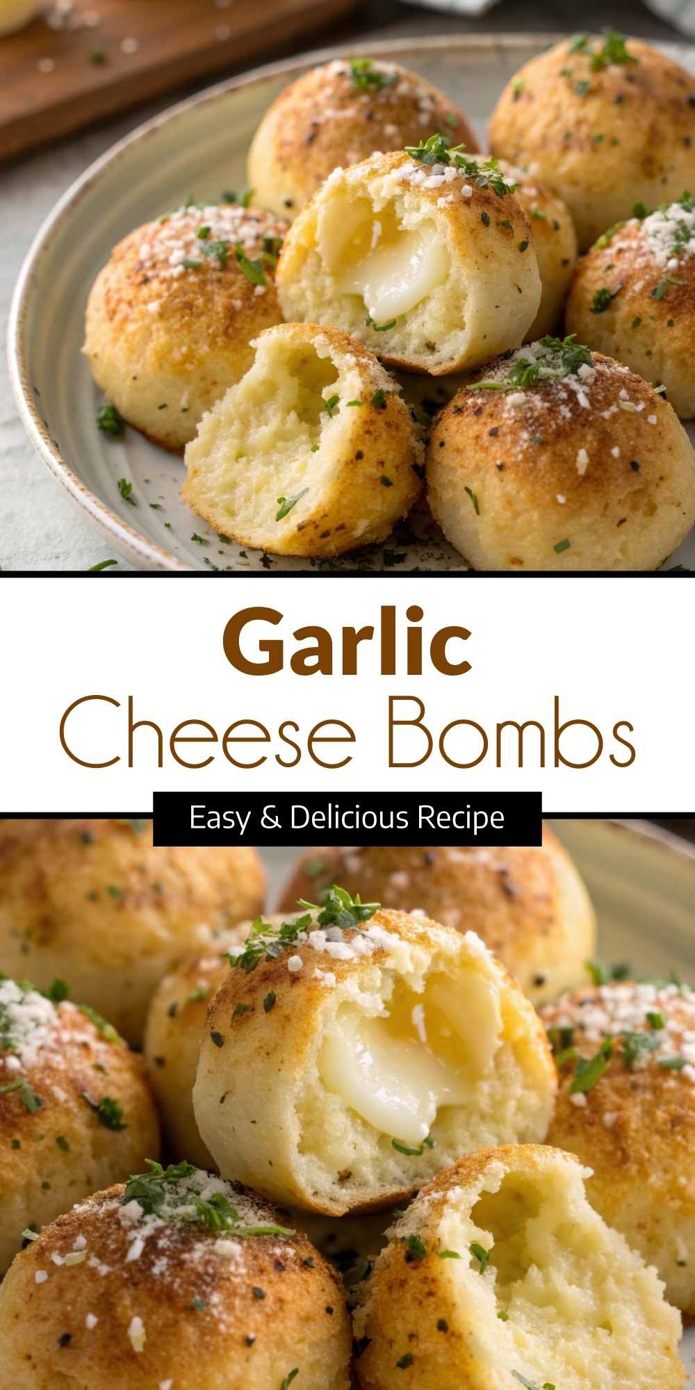 These Garlic Cheese Bombs are little pockets of melty cheddar wrapped in buttery biscuit dough, rolled in garlic butter, and baked until golden. They’re the ultimate cheesy, garlicky snack or party side.