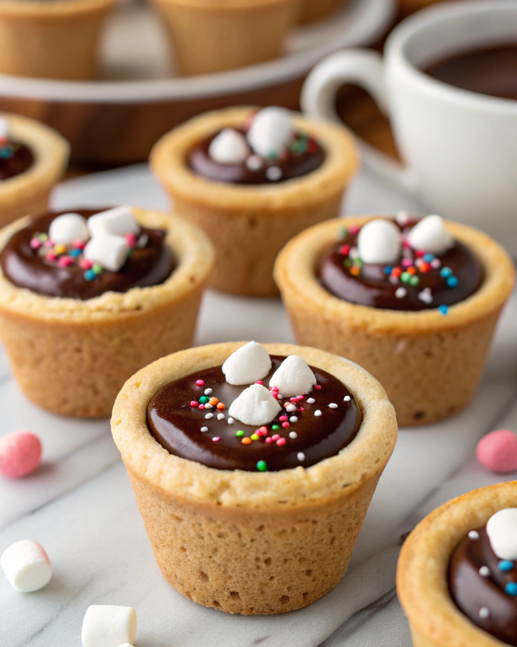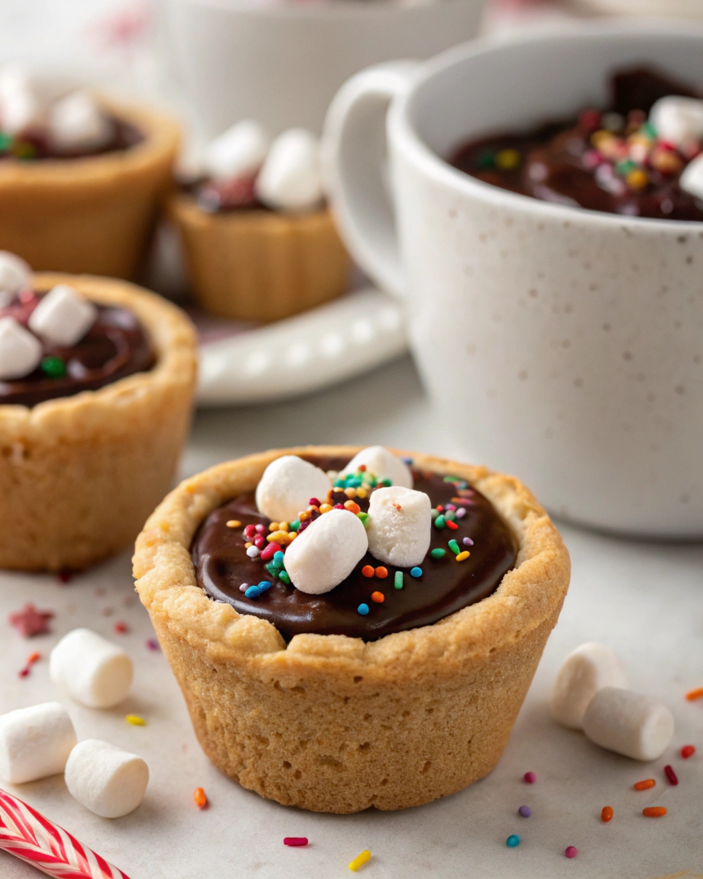 Of course, no “hot chocolate” is complete without marshmallows, and these cookie cups deliver. Mini marshmallows are pressed into the warm ganache and Nutella layer, offering a soft, pillowy sweetness that feels nostalgic and playful. Sprinkles add the final touch of holiday magic, bringing color and cheer to every bite.