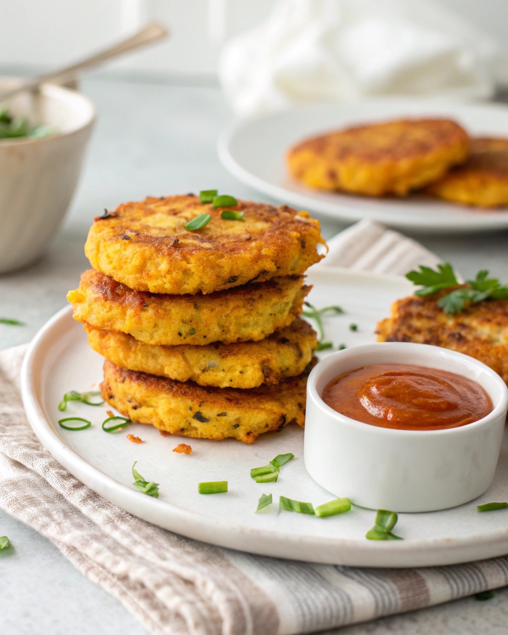 Perfect as a side dish, a quick lunch, or even meal prep for the week, these fritters are versatile and customizable — try them with avocado, Greek yogurt dip, or spicy sriracha ketchup.