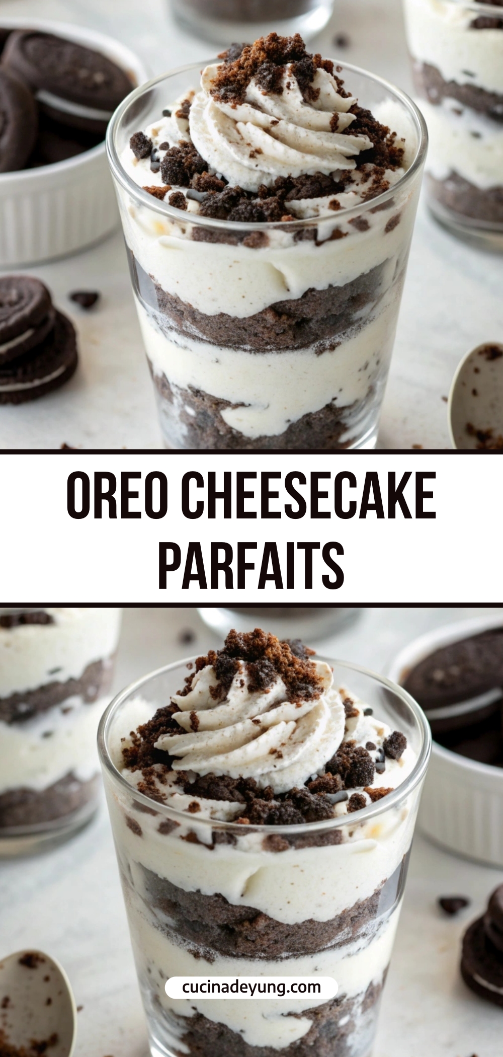 Spoon a layer of Oreo crumbs into the bottom of each parfait glass, followed by a generous layer of cheesecake filling. Repeat the layers until glasses are full, finishing with a dollop of cheesecake cream on top.