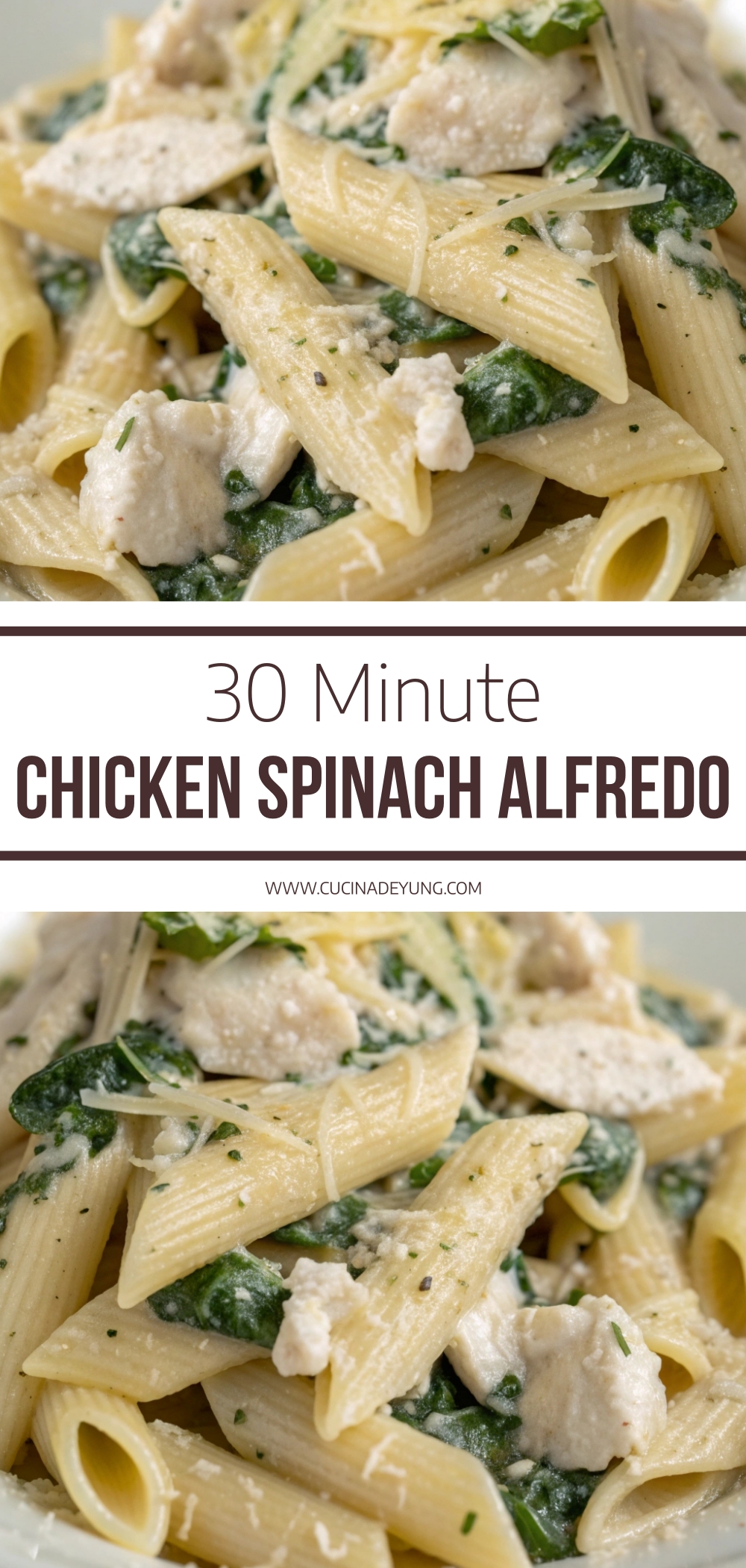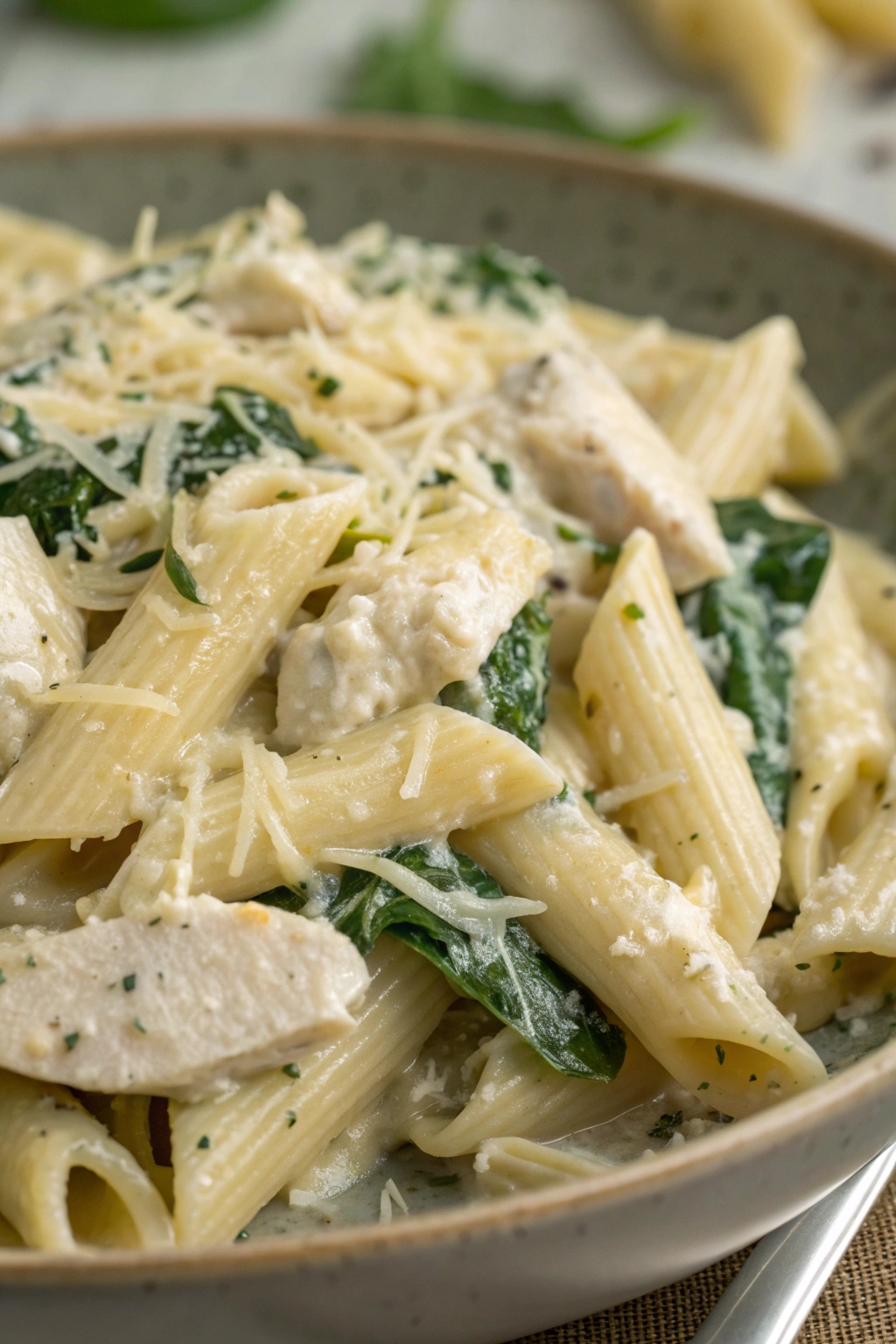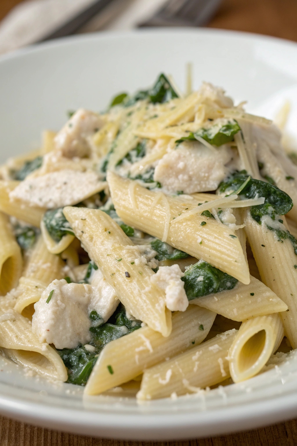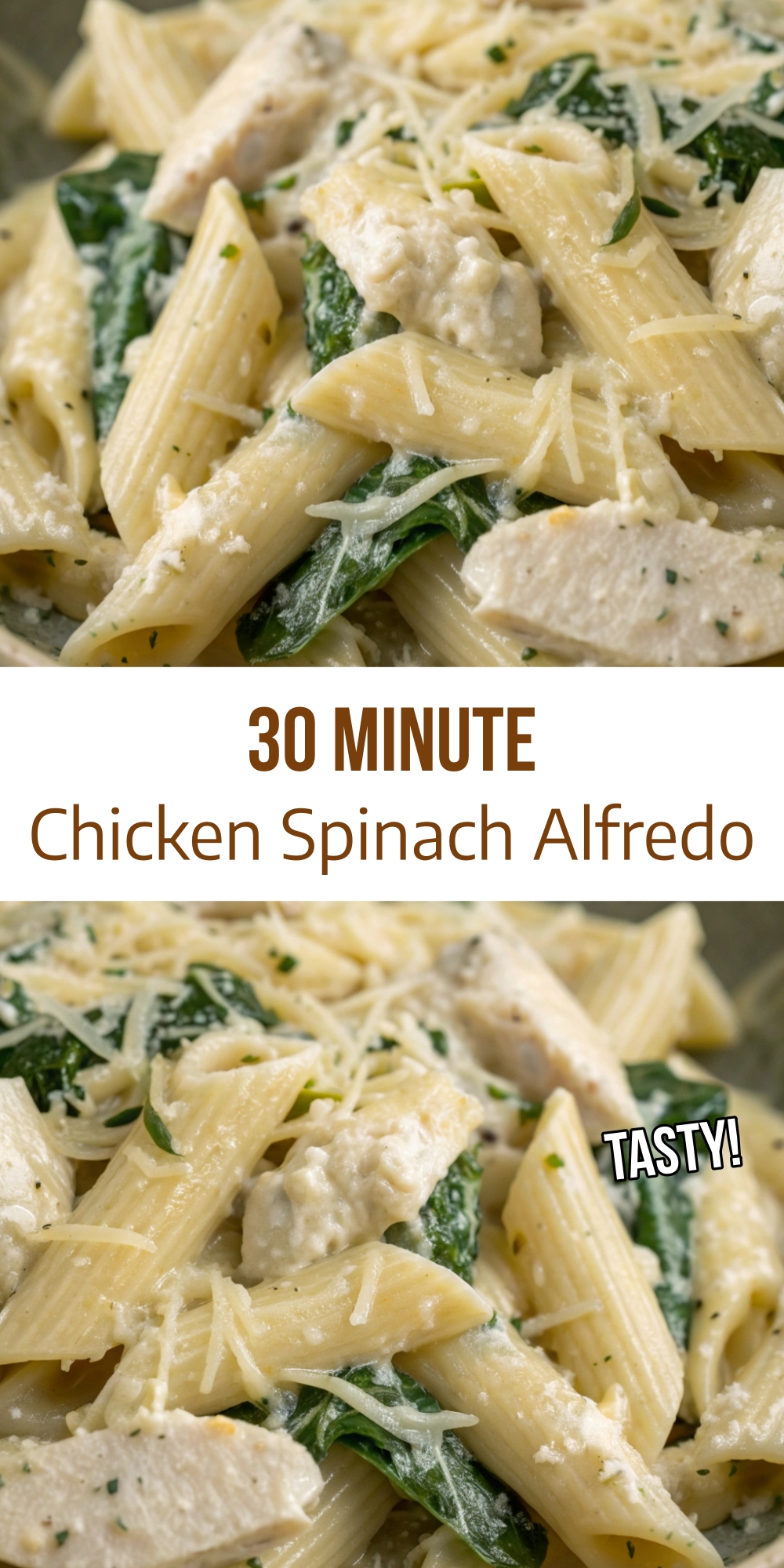 This 30-minute chicken spinach alfredo is a creamy, comforting pasta dinner that comes together fast using simple pantry ingredients. Tender chicken, fresh spinach, and penne pasta are coated in a light yet flavorful homemade alfredo sauce that’s rich, satisfying, and perfect for everyday meals.