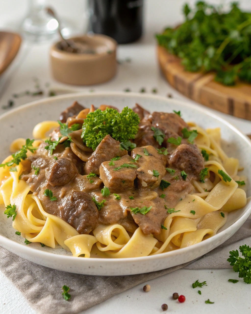 What makes this version so good? It skips the roux and complicated steps in favor of canned soups that thicken into a savory gravy, and finishes with a generous scoop of sour cream for richness. You cook the beef low and slow until it’s melt-in-your-mouth tender, stir in the cream, and ladle it over buttery egg noodles. That’s it.