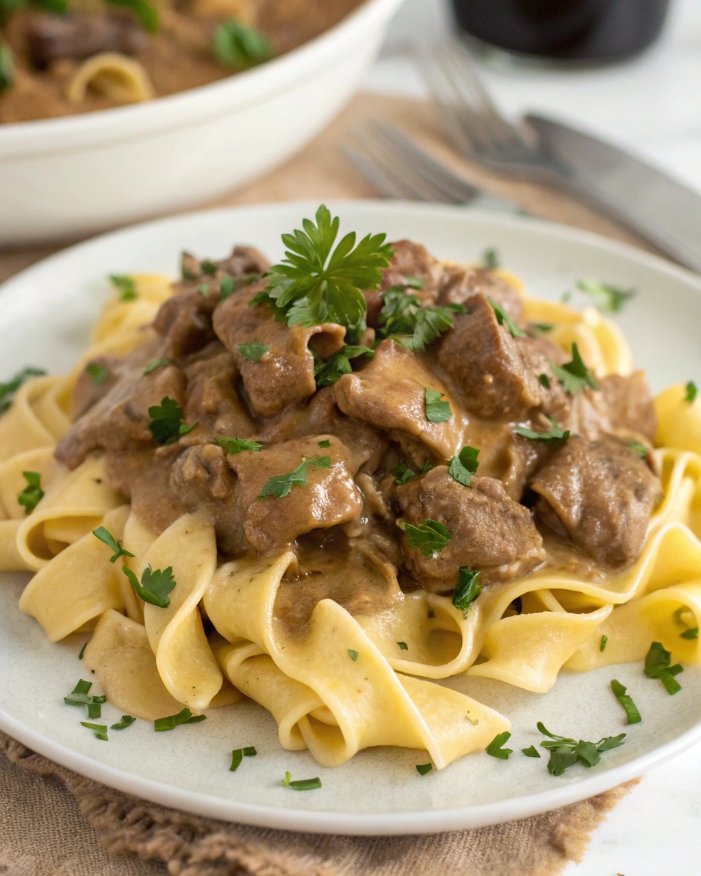 What makes this version so good? It skips the roux and complicated steps in favor of canned soups that thicken into a savory gravy, and finishes with a generous scoop of sour cream for richness. You cook the beef low and slow until it’s melt-in-your-mouth tender, stir in the cream, and ladle it over buttery egg noodles. That’s it.