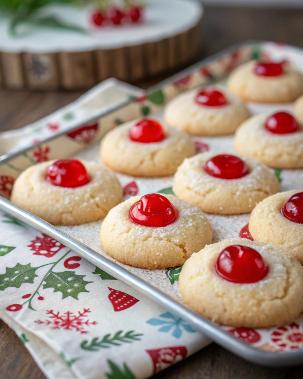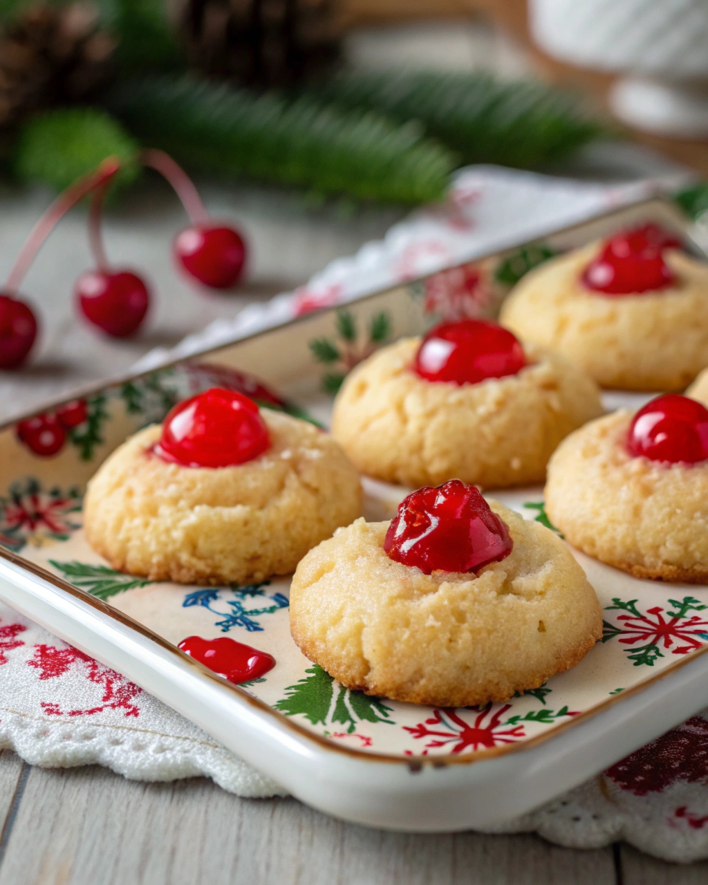 These cookies are especially popular during Christmas because of their bright red cherry topping, which adds instant holiday color without the need for frosting or decorations. They look beautiful arranged on platters, cookie boxes, and dessert tables.