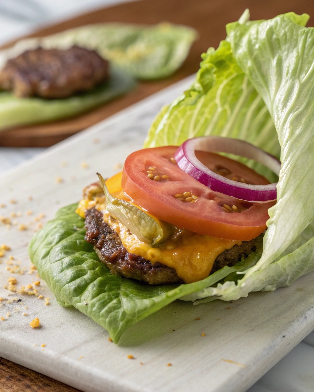 Cheeseburger flavors wrapped in crisp lettuce: juicy beef patties, American cheese, tomato, onion, and burger spread—deliciously low‑carb and fun to eat.