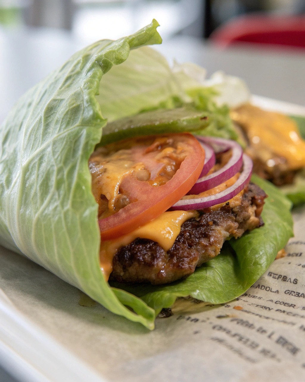 Cheeseburger flavors wrapped in crisp lettuce: juicy beef patties, American cheese, tomato, onion, and burger spread—deliciously low‑carb and fun to eat.
