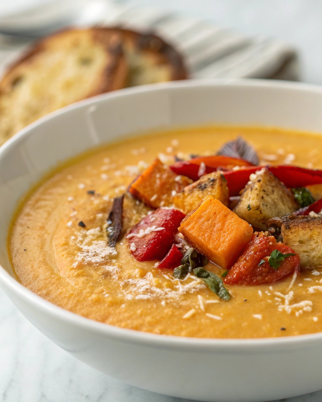 - Garnish and Serve: Ladle into bowls and top with the reserved roasted vegetables and an extra sprinkle of Parmesan cheese.