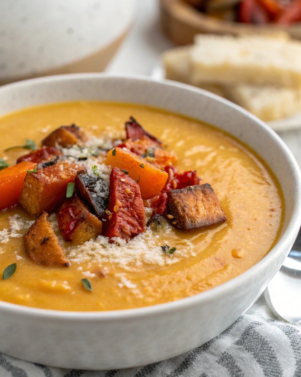 Garnish and Serve: Ladle into bowls and top with the reserved roasted vegetables and an extra sprinkle of Parmesan cheese.