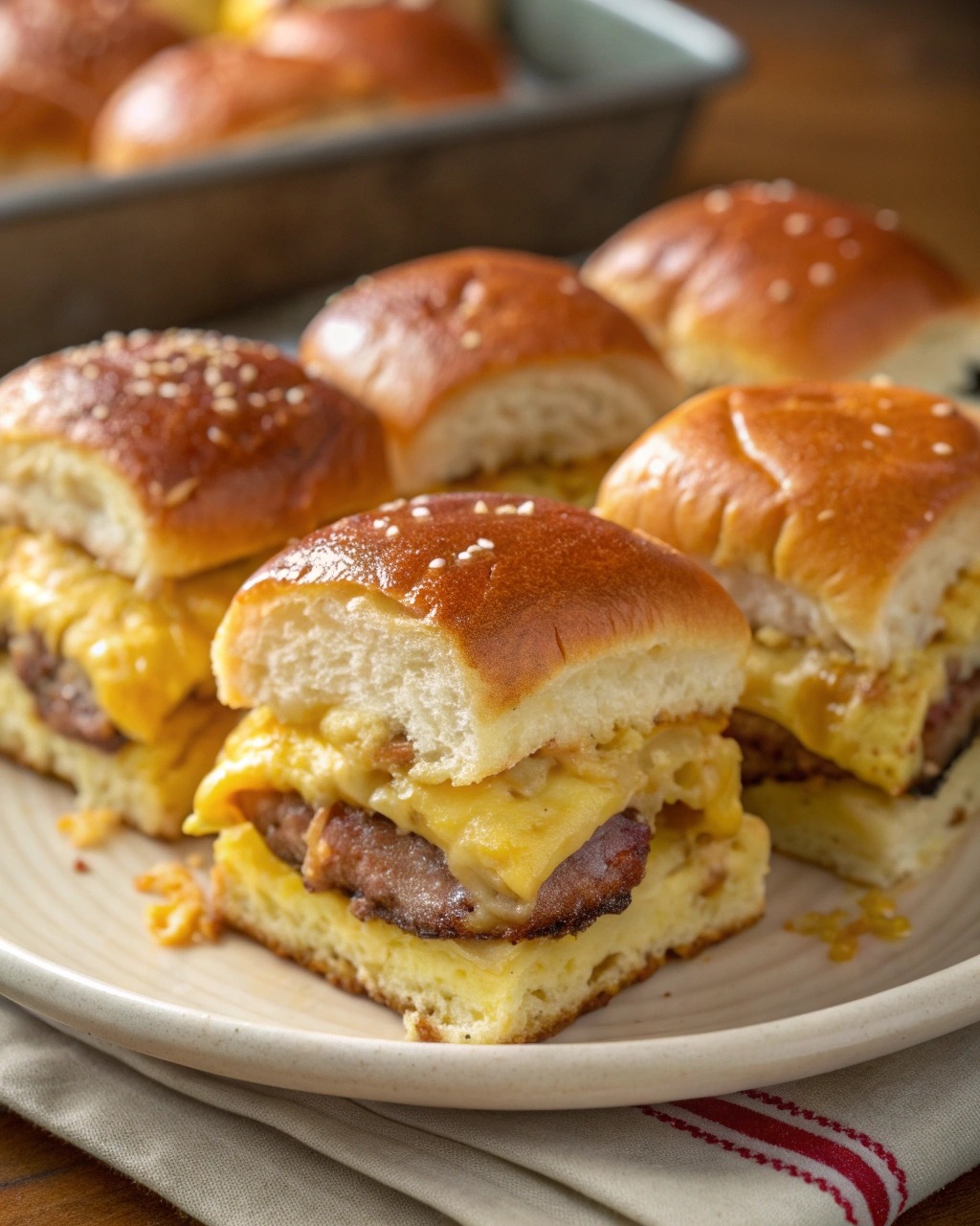 Breakfast sliders stacked with sausage patties, scrambled eggs, pepper jack and American cheese, brushed with maple‑butter glaze and baked on Hawaiian rolls—savory, sweet, and ideal for mornings or gatherings.