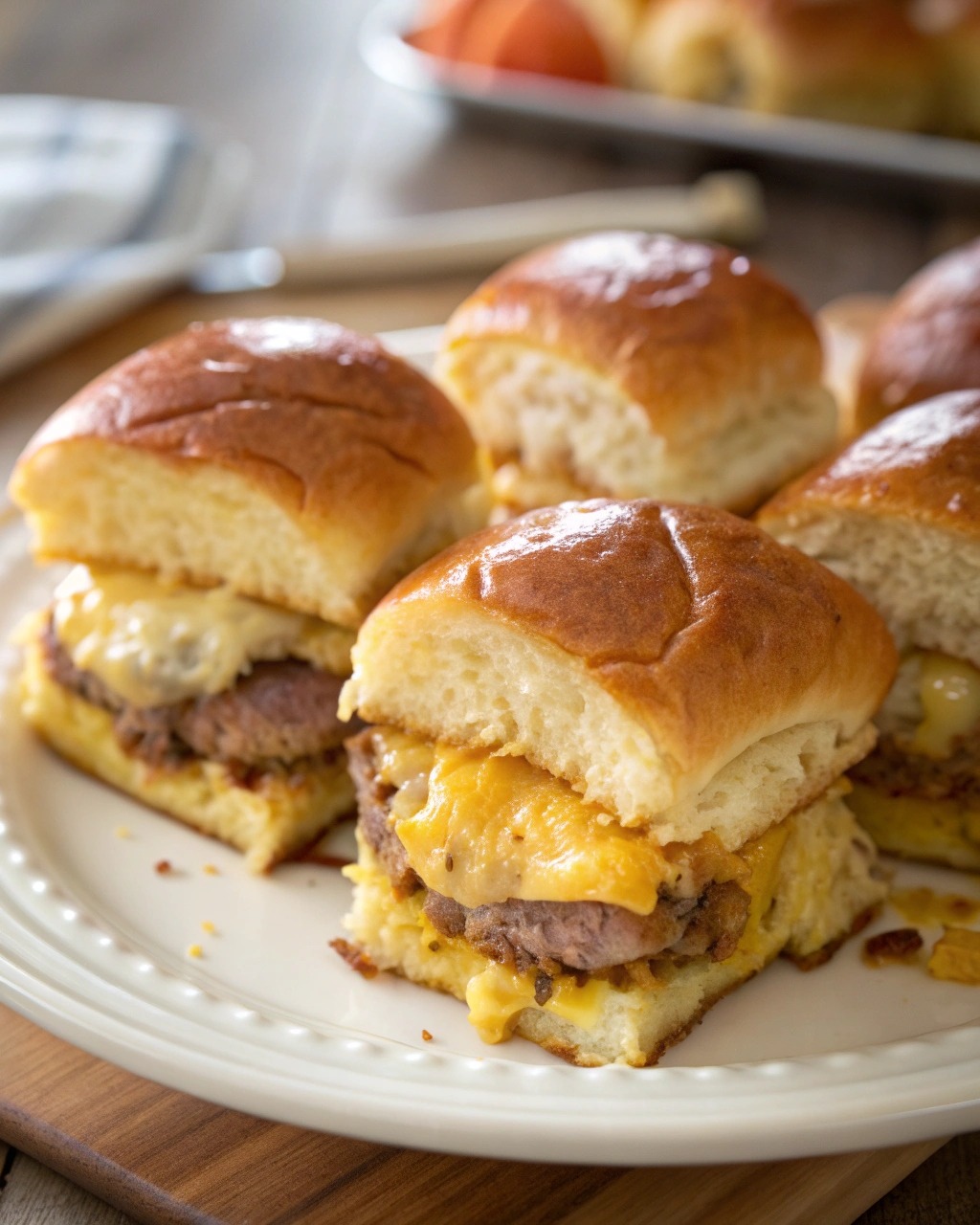 When baked at 350°F for about 15–20 minutes, the cheese bubbles, the glaze caramelizes slightly, and the rolls steam into the filling beneath. The result: sliders that are gooey, sweet, salty, and filling. Each bite bursts with sausage flavor, egg fluff, melted cheese, and a hint of maple butter sweetness. Because everything is layered and baked together, flavors meld but each component retains identity.