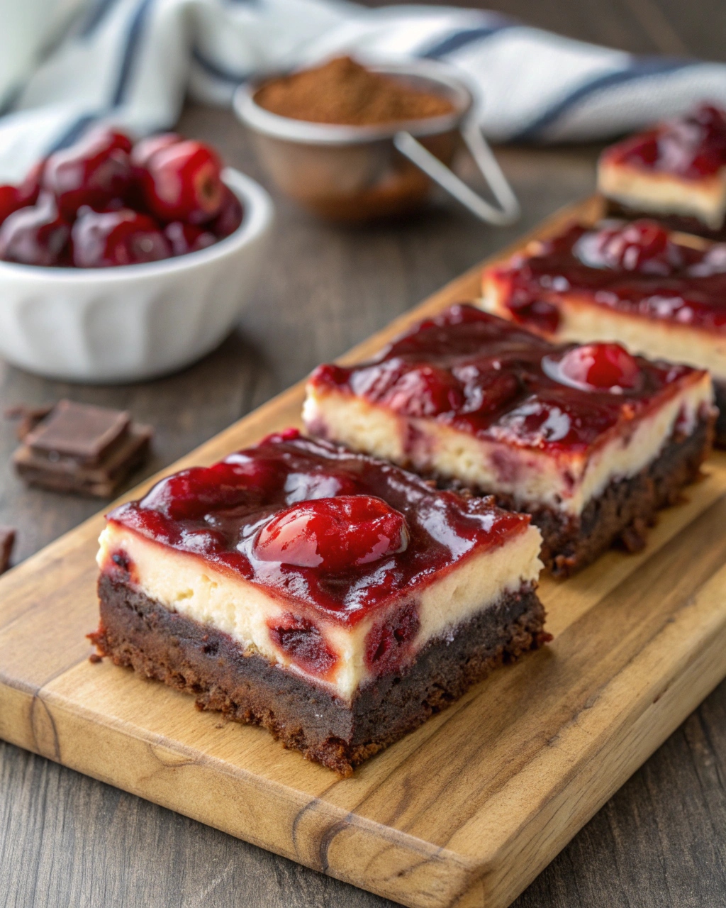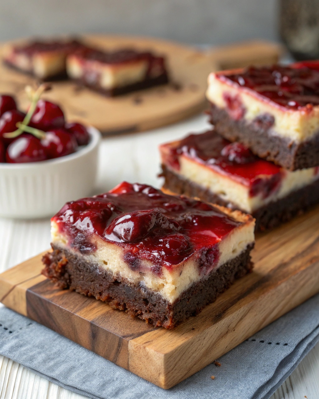 These bars offer the perfect balance of flavors and textures—deep chocolate richness, velvety cheesecake creaminess, and juicy cherry sweetness. They look stunning on a dessert table yet require no complicated techniques. The brownie base stays moist and fudgy, while the cheesecake bakes into a beautifully smooth layer that supports the vibrant cherry topping. They slice cleanly, chill well, and taste even better the next day. Whether you need a holiday dessert, a potluck dish, or a special treat for family night, these brownies will always be a hit.
