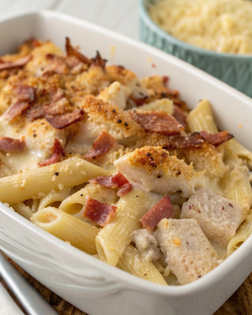 The texture is incredibly satisfying. Creamy pasta, tender chicken, crispy topping, and bits of savory meat create a balanced bite.