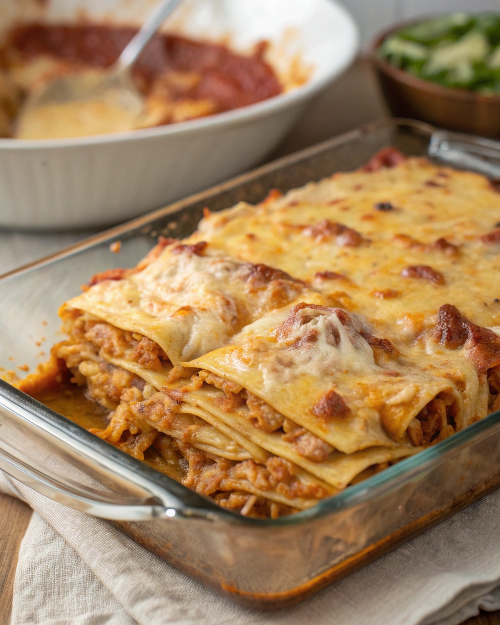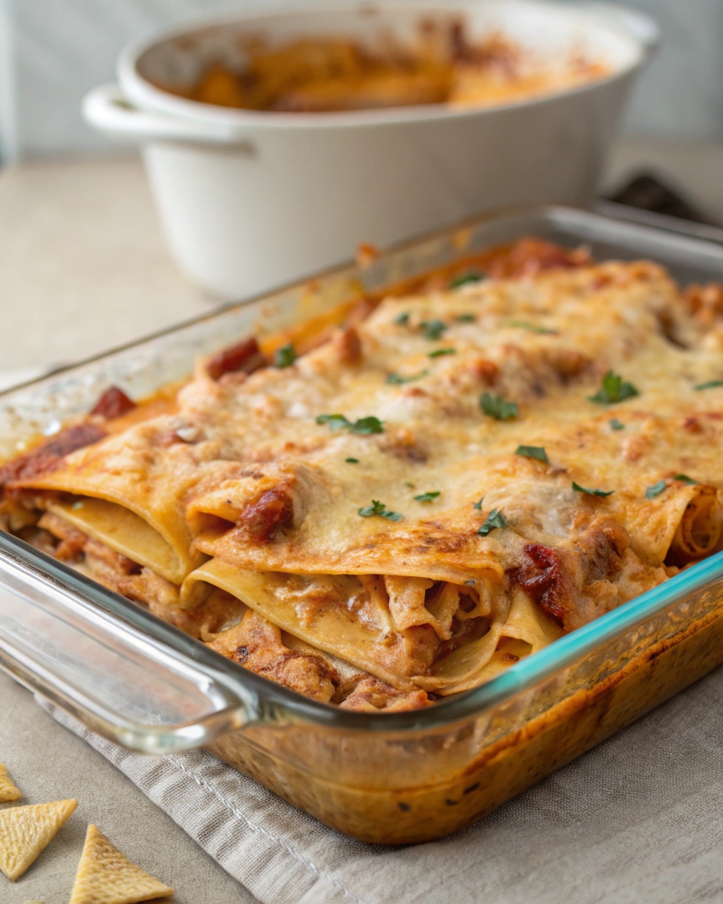 The cheese—Monterey Jack—is the final key component, lending a perfectly melty, creamy finish. Its mild flavor complements the enchilada sauce, while its excellent meltability creates those irresistible cheesy stretches with every scoop. Once baked, the top becomes bubbly, golden, and lightly crisp around the edges, making the casserole visually inviting and incredibly delicious.