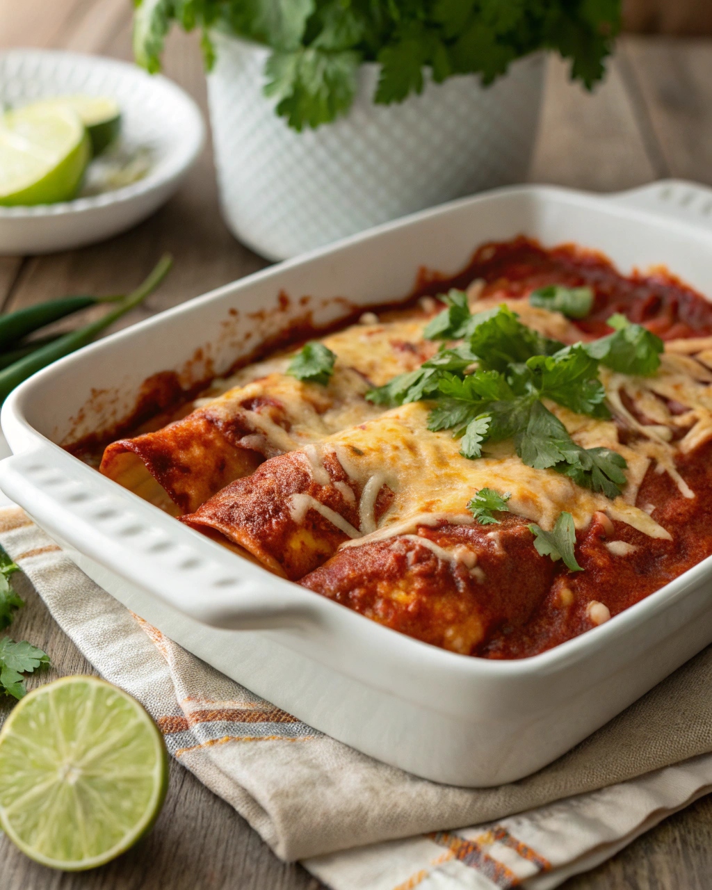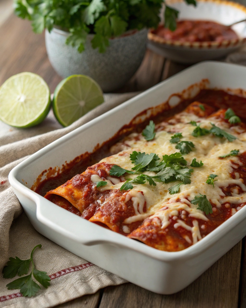 Every bite of these enchiladas delivers that perfect contrast — the slightly crisped tortilla edges baked in sauce, the gooey melted cheese stretching as you pull apart your serving, and the smoky sweetness of the sauce layered through it all. This dish isn’t just food — it’s comfort, warmth, and joy on a plate.