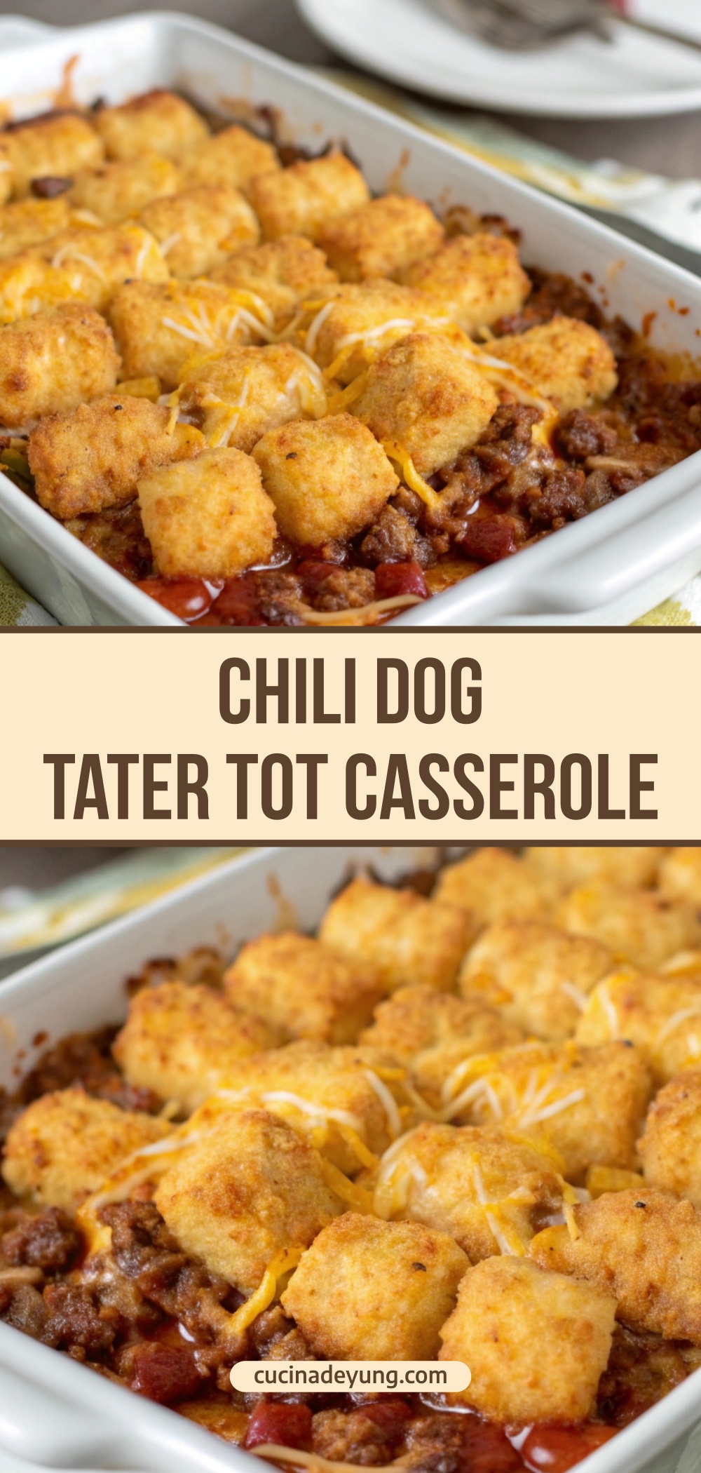 This Chili Dog Tater Tot Casserole layers seasoned ground beef chili with bite-sized hot dog pieces under a blanket of melted cheddar and crispy tater tots—an irresistible, one-dish dinner that’s nostalgic, hearty, and simple.