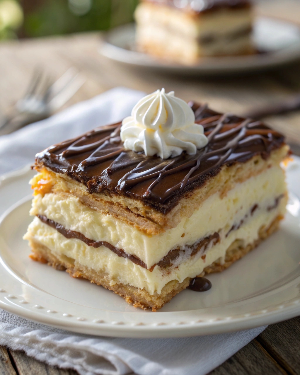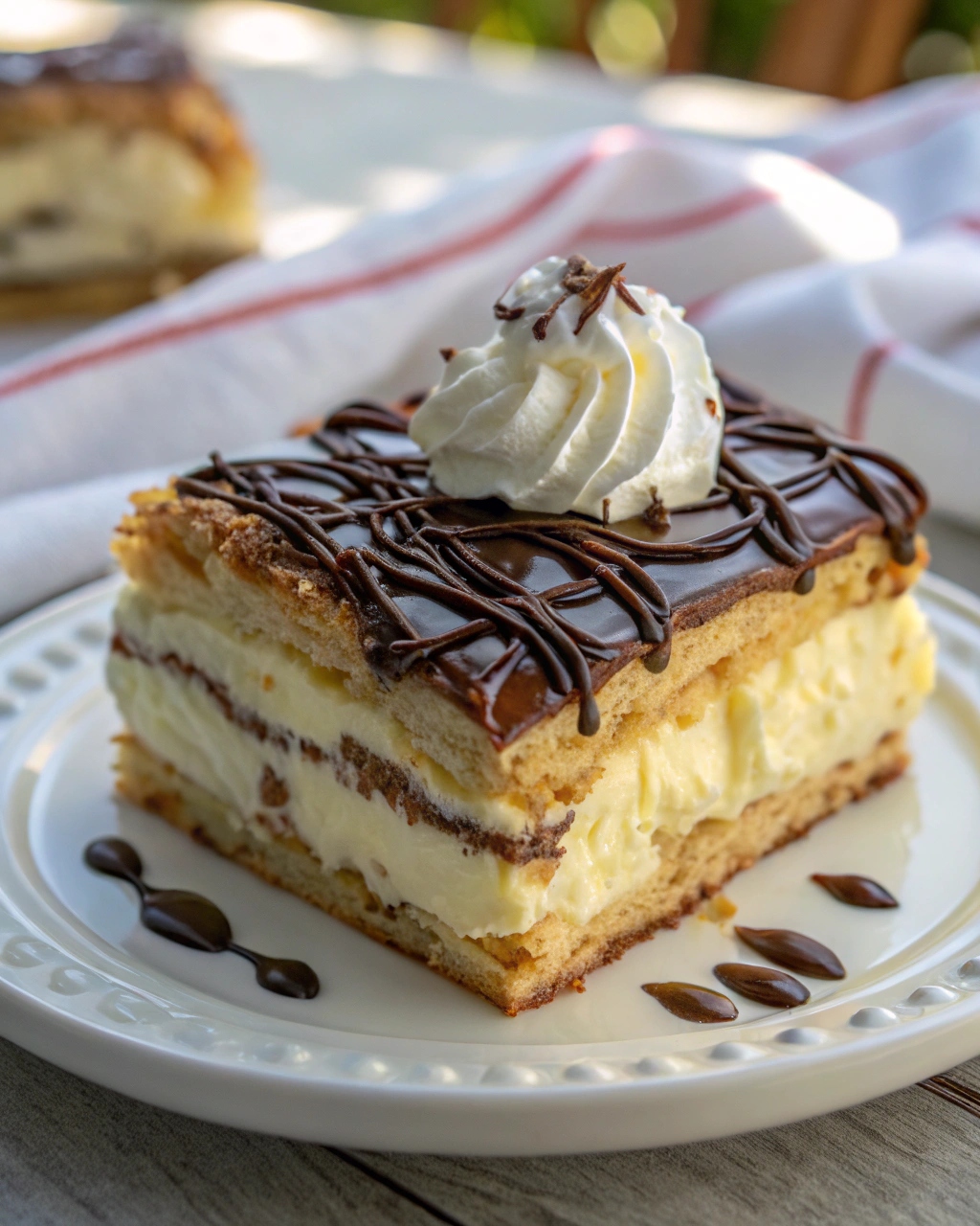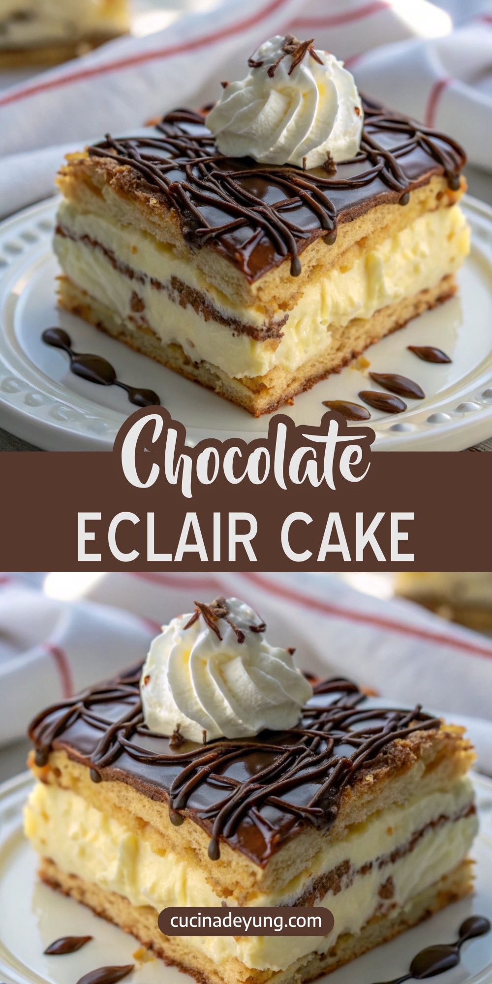 This Chocolate Eclair Cake is a dreamy, no-bake dessert that’s as elegant as it is easy. Layers of soft pastry, smooth vanilla pudding, and fluffy whipped cream come together under a drizzle of chocolate sauce — creating a dessert that melts in your mouth. Perfect for gatherings, celebrations, or when you crave something indulgent without turning on the oven.