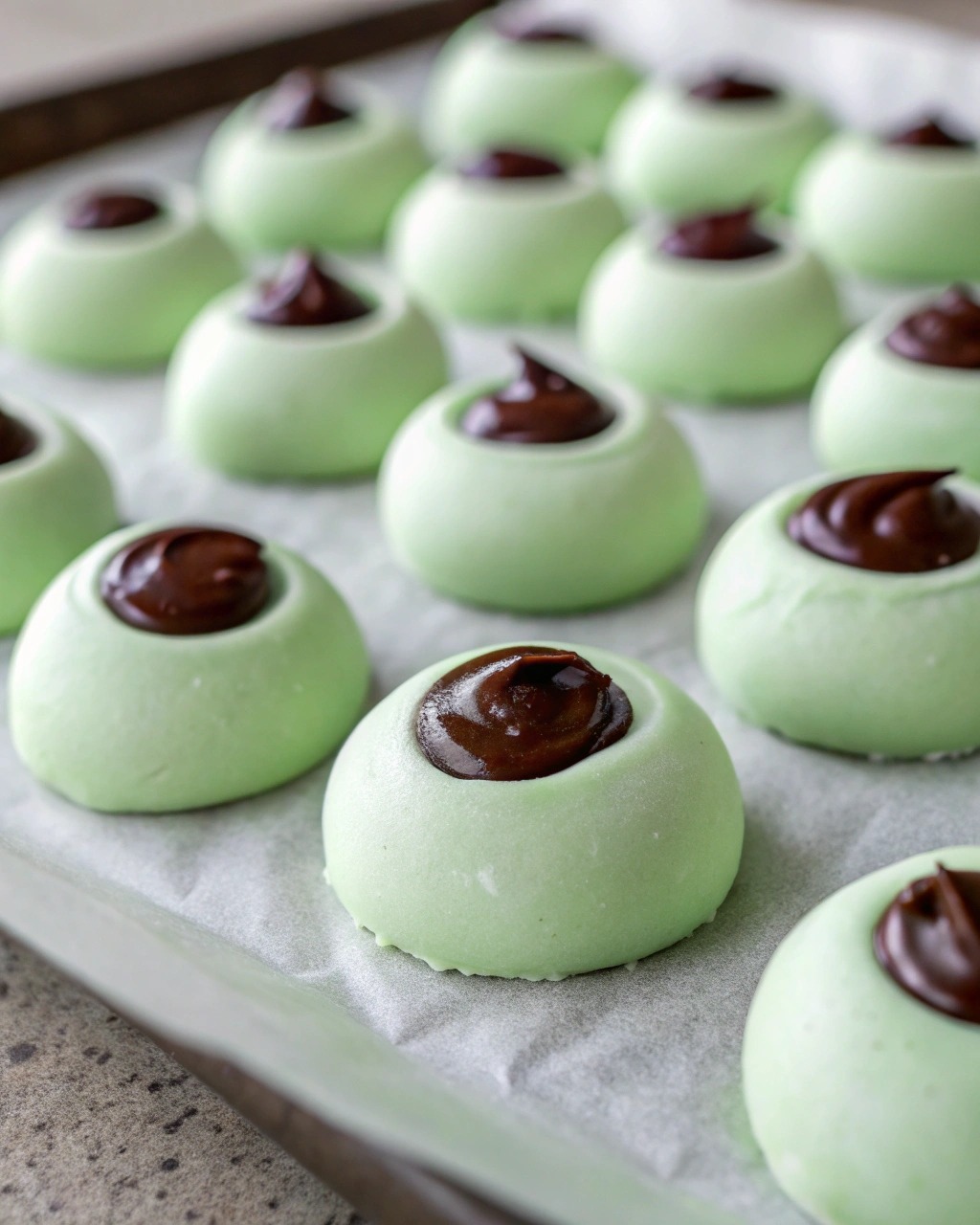 These treats shine at holiday gatherings, dessert trays, or as elegant homemade gifts. Their visual appeal—pale green shell with chocolate centers—makes them stand out on a dessert platter. The technique is forgiving: pipe shells with shallow wells, pour warm ganache, allow to set. Variations are easy—double chocolate mint, peppermint flavoring, or dark chocolate ganache for deeper contrast.