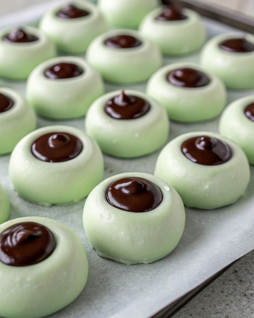 These treats shine at holiday gatherings, dessert trays, or as elegant homemade gifts. Their visual appeal—pale green shell with chocolate centers—makes them stand out on a dessert platter. The technique is forgiving: pipe shells with shallow wells, pour warm ganache, allow to set. Variations are easy—double chocolate mint, peppermint flavoring, or dark chocolate ganache for deeper contrast.
