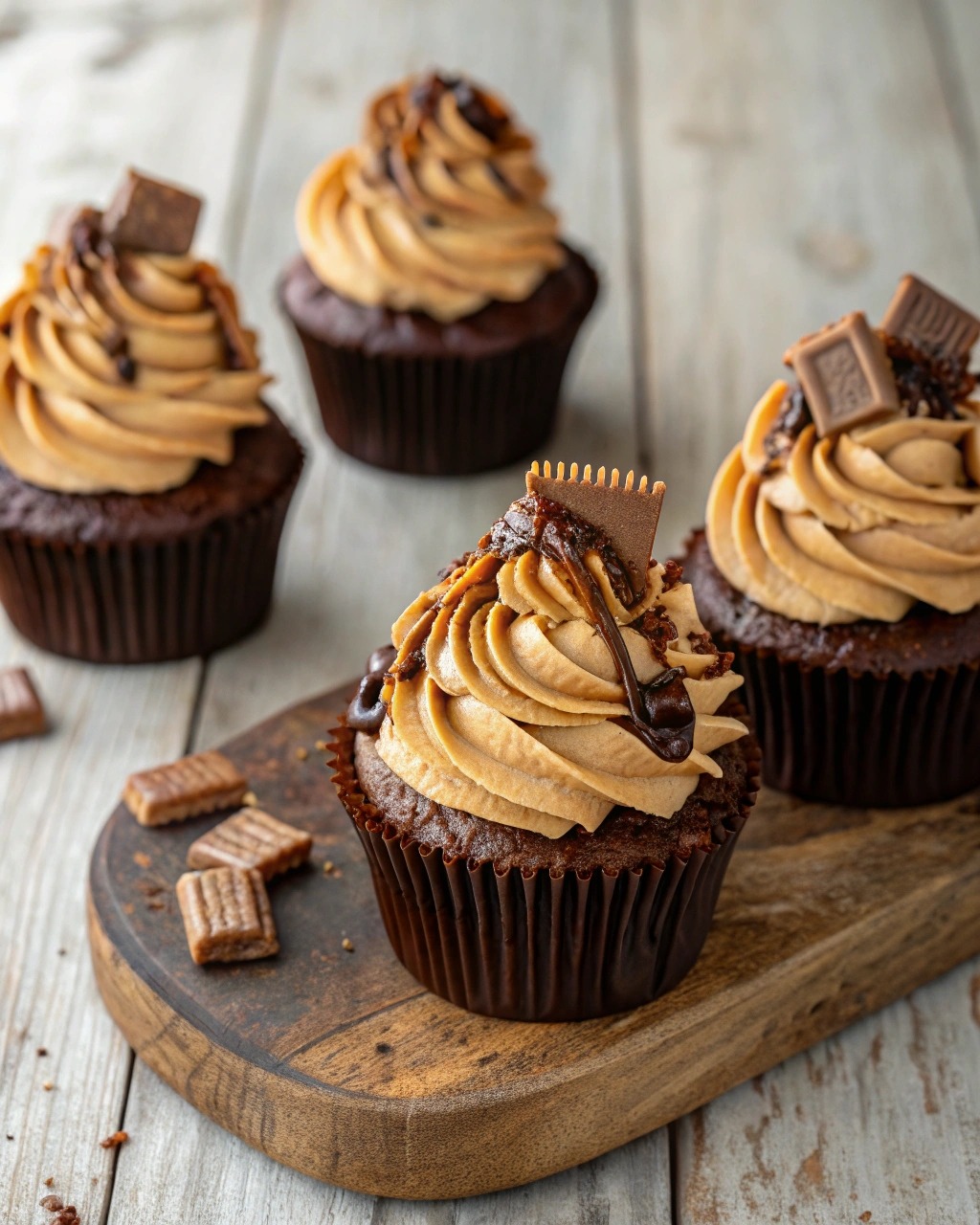 Rich chocolate cupcakes made with a molten peanut butter cup center, topped with creamy peanut butter frosting and optional chocolate ganache. Decadent, layered flavors in every bite.