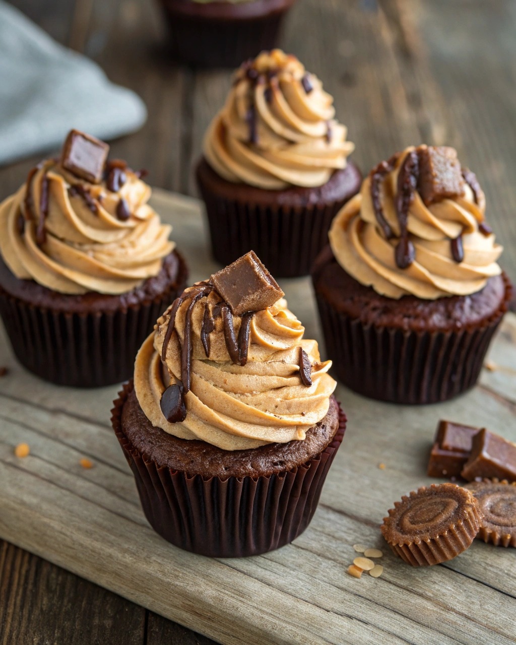 Rich chocolate cupcakes made with a molten peanut butter cup center, topped with creamy peanut butter frosting and optional chocolate ganache. Decadent, layered flavors in every bite.