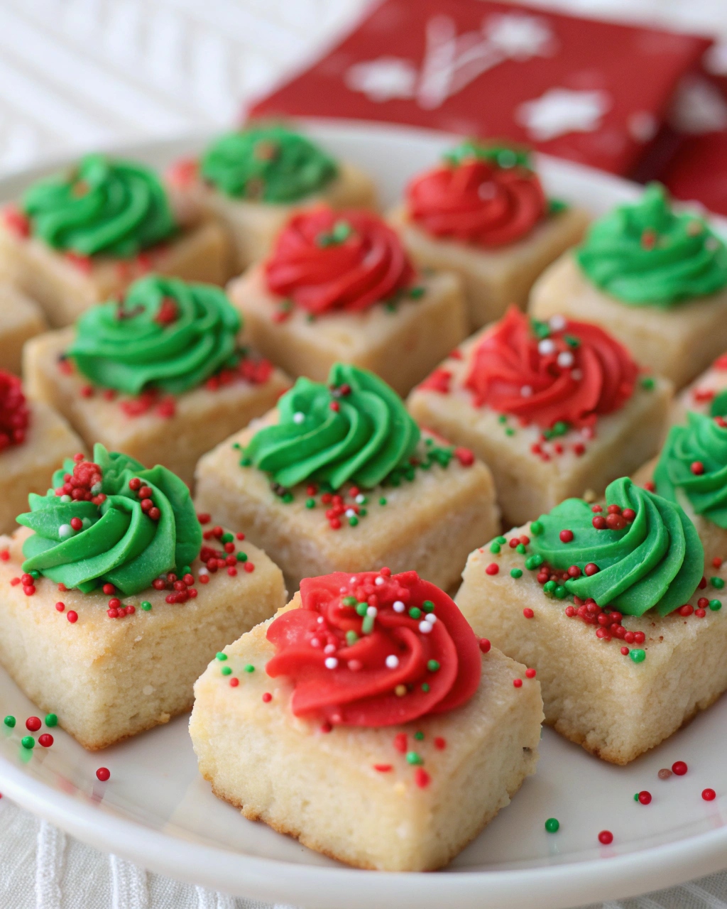 These cookies are buttery, tender, and lightly sweet, making them the perfect base for colorful holiday decorations. The vanilla frosting adds a creamy contrast, while the red and green sprinkles instantly make them feel festive and Christmas-ready.
