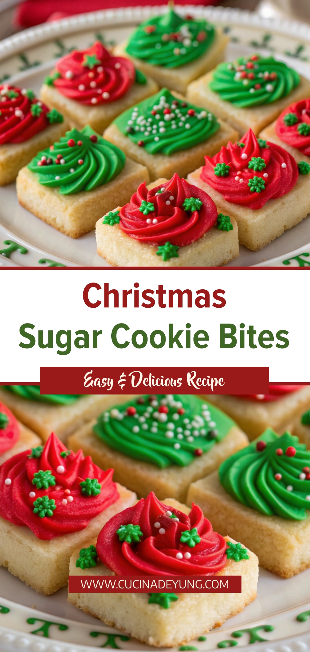 Christmas Sugar Cookie Bites are adorable, bite-sized holiday cookies that capture the classic buttery sweetness of sugar cookies in a fun mini form. Made with simple pantry ingredients and topped with red and green frosting and sprinkles, these festive cookie squares are perfect for Christmas dessert platters, cookie exchanges, and holiday parties. Their small size makes them easy to serve, visually appealing, and irresistible for both kids and adults during the holiday season.