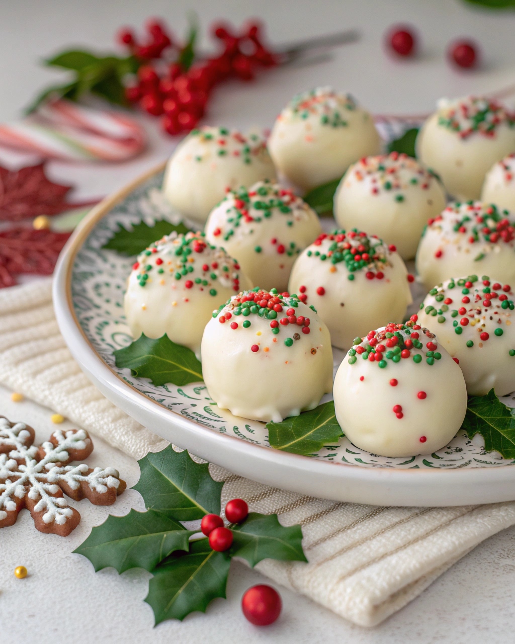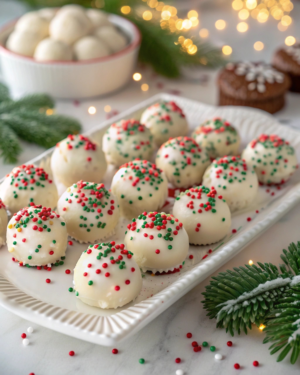 These truffles are especially popular during Christmas because they’re visually festive. The white chocolate coating acts as a perfect canvas for colorful holiday sprinkles, making them look like tiny ornaments on your dessert table. They’re eye-catching, cheerful, and instantly signal that “Christmas magic” everyone loves.