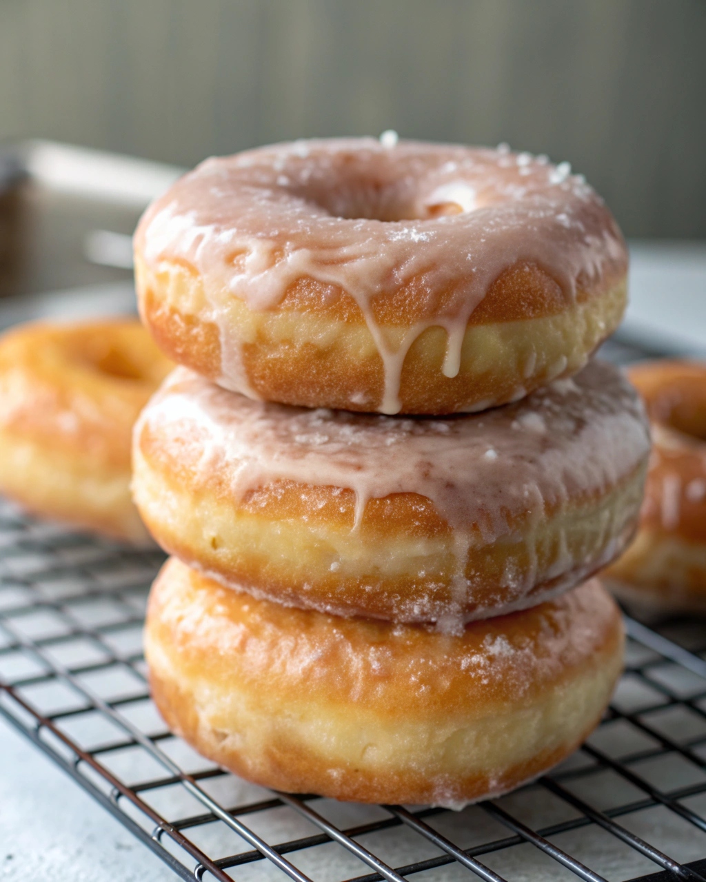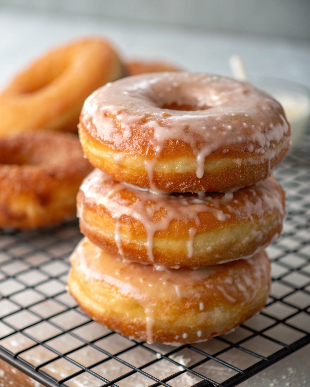 The glaze is intentionally simple. Powdered sugar, milk, and a pinch of salt create a smooth, sweet coating that sets into that iconic donut glaze finish. Dipping the donuts while they’re still warm allows the glaze to cling and drip beautifully.