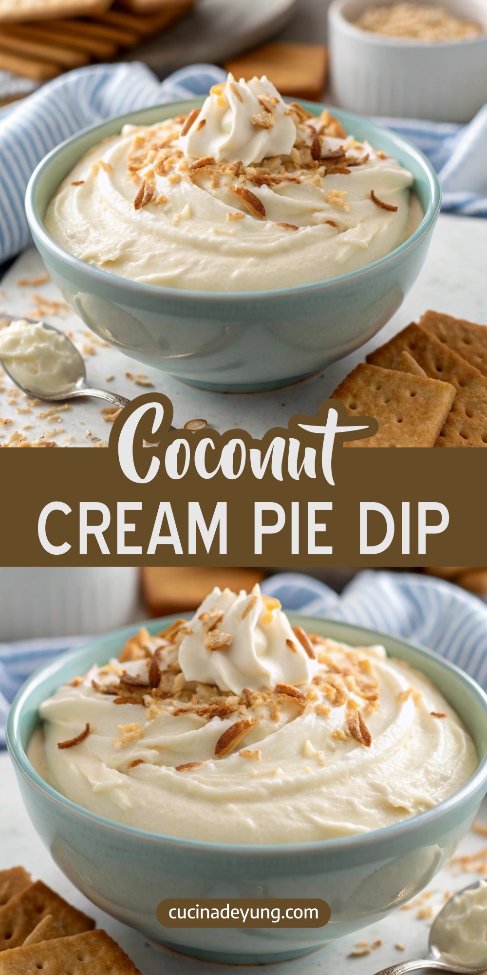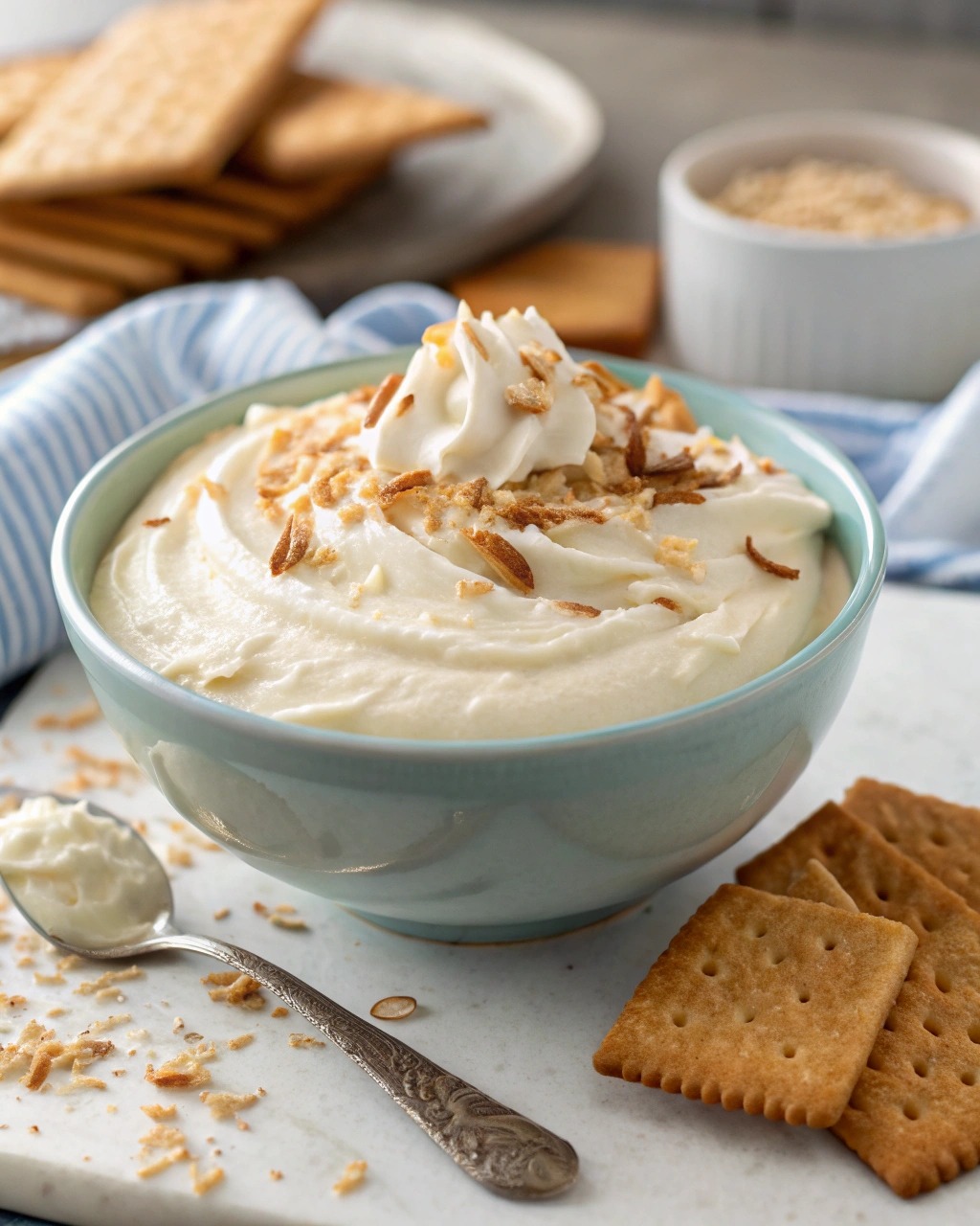 A silky, no‑bake dip that tastes like coconut cream pie—made from a custard base of eggs and half‑and‑half, folded with Cool Whip, and sprinkled with toasted coconut. Serve with cookies or crackers.