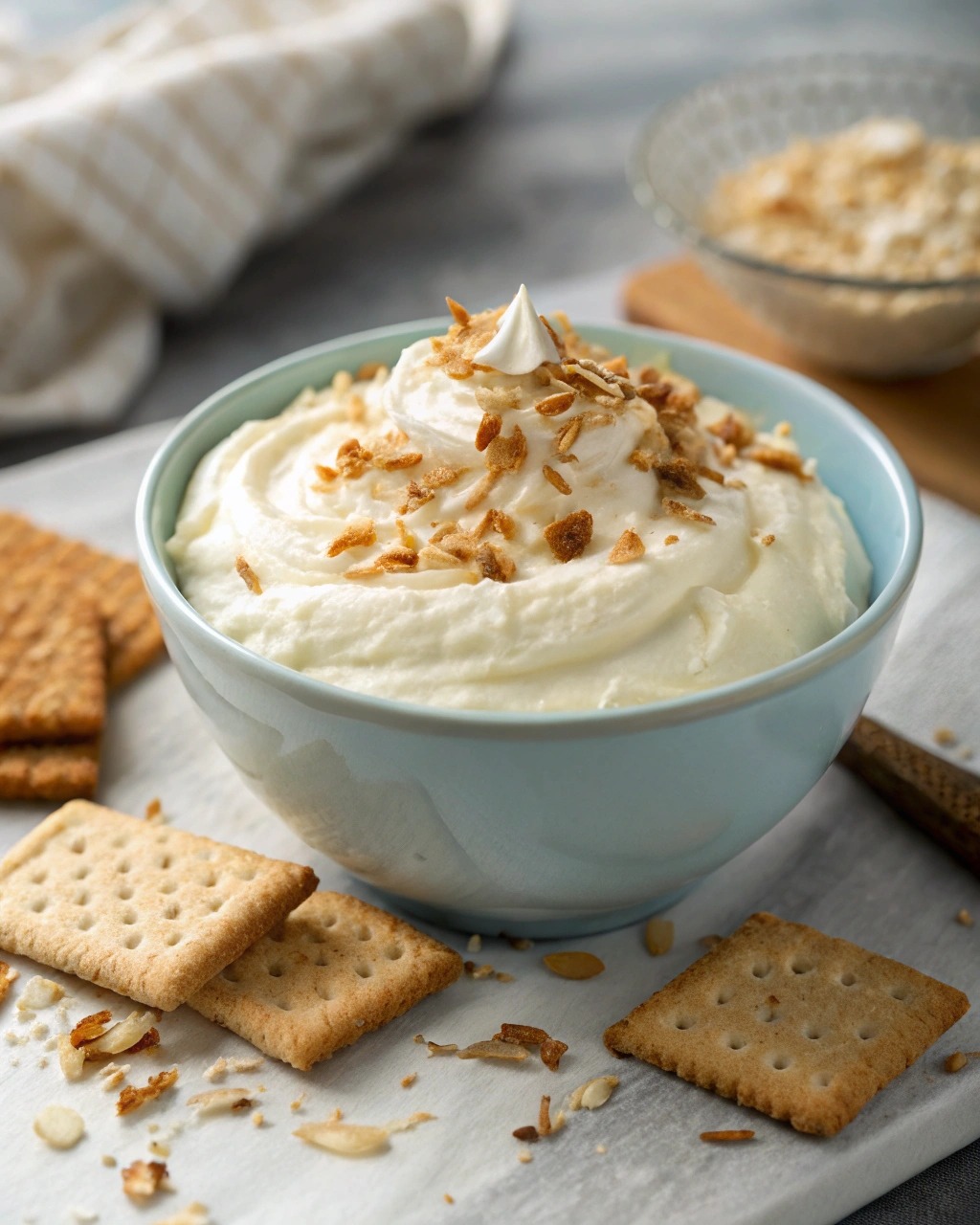 A silky, no‑bake dip that tastes like coconut cream pie—made from a custard base of eggs and half‑and‑half, folded with Cool Whip, and sprinkled with toasted coconut. Serve with cookies or crackers.