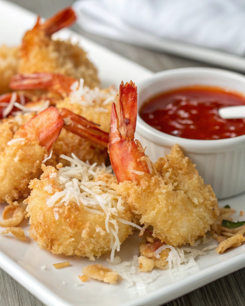 One of the secrets to achieving the perfect crispy coconut shrimp is layering the coating properly. First, the shrimp are dredged in flour to help the egg adhere. Then they’re dipped in beaten eggs before being coated in a flavorful mixture of panko breadcrumbs and shredded coconut. This triple-layer method ensures maximum crunch.