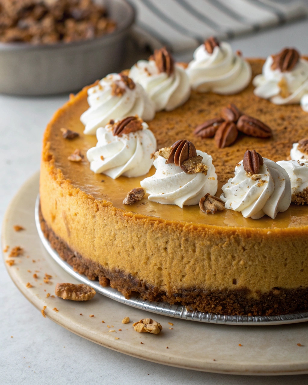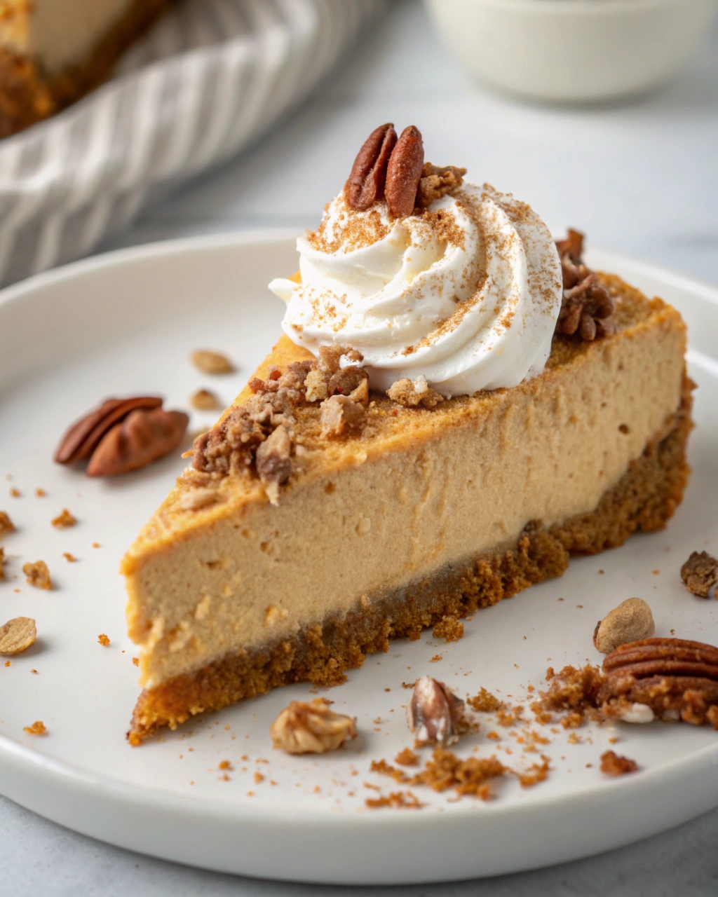 Topped with lightly sweetened whipped cream and toasted pecans, this dessert adds texture and visual appeal while complementing the pumpkin flavors beautifully.