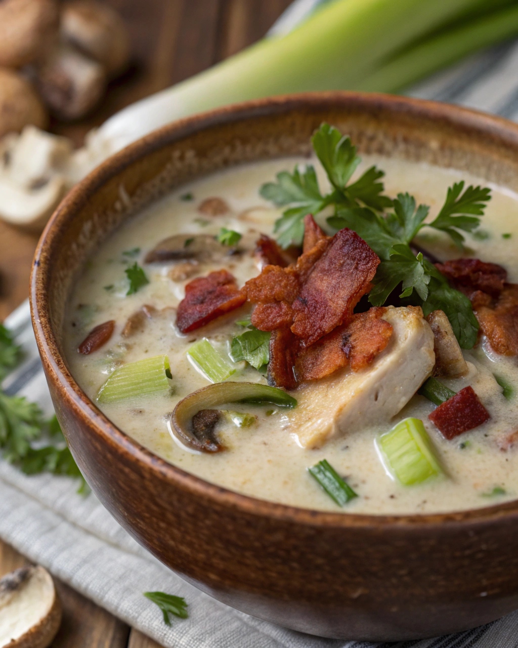Mushrooms play an important role in this recipe, adding depth and umami that enhance the chicken and broth. Shiitake mushrooms, in particular, bring an earthy flavor that pairs beautifully with the creamy base and smoky turkey bacon. Each spoonful delivers a comforting mix of textures and flavors that feels thoughtfully composed.