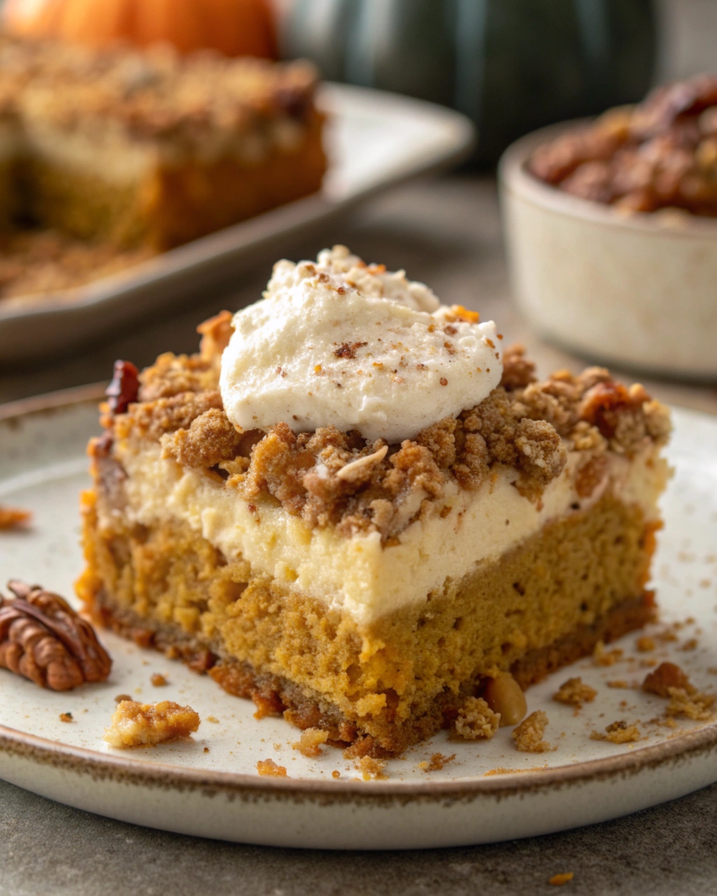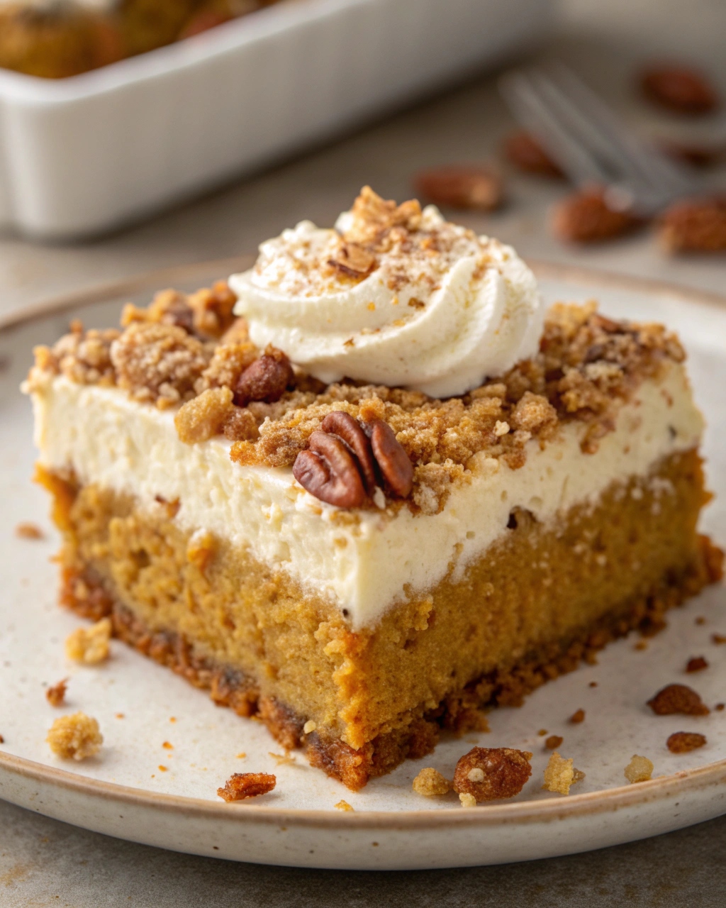 You’ll love this recipe because it delivers big autumn flavor with minimal effort. Using cake mix as the topping creates a buttery, crisp layer that perfectly contrasts with the creamy pumpkin filling. The added pecans give an irresistible crunch, while the fluffy cream cheese topping adds a dreamy finish. It’s easier than pie, perfect for holidays, potlucks, and family gatherings.