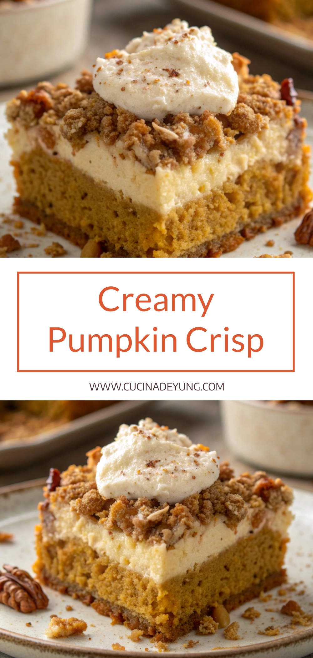 Creamy Pumpkin Crisp is a rich, layered fall dessert featuring velvety pumpkin custard, a buttery cake-mix crumble topping, crunchy pecans, and a smooth cream cheese–Cool Whip frosting. It bakes beautifully in a 9×13 pan, slices cleanly, and tastes like a cross between pumpkin pie and a crisp—creamy, crunchy, and irresistibly comforting.
