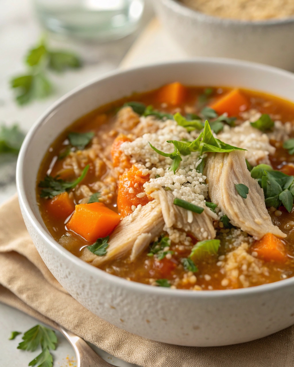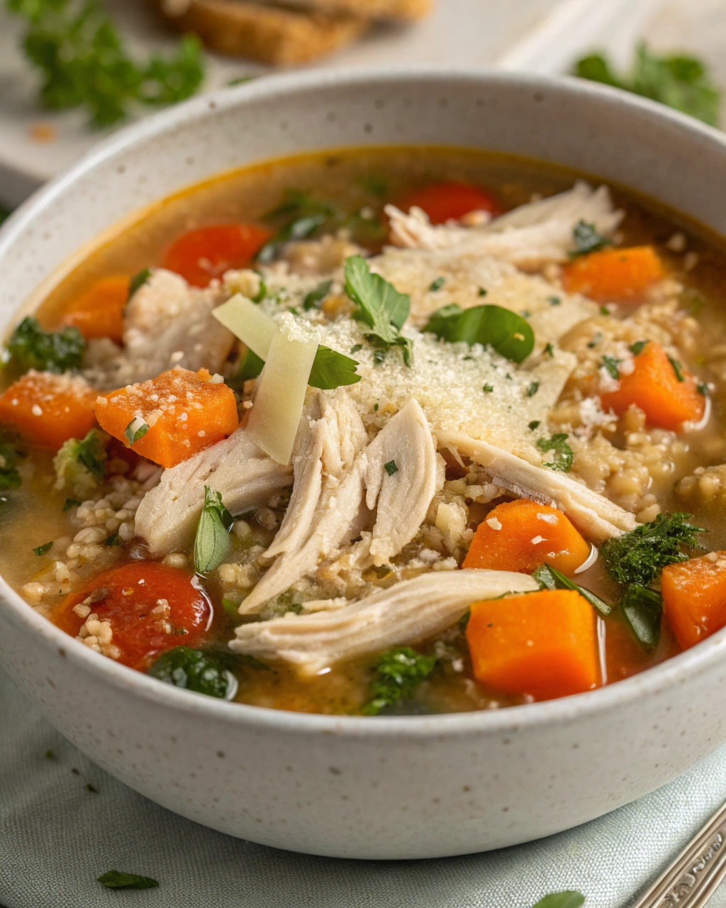 Parmesan cheese adds a final layer of richness. It melts slightly into the soup, enhancing the overall flavor.