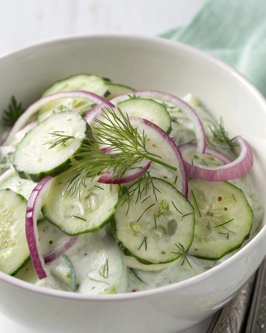 Above all, this cucumber salad is a reminder of how delightful simple ingredients can be when treated with care. Crisp cucumbers, a creamy tangy dressing, and a hint of dill come together in a dish that feels both classic and timeless. Whether you’re sharing it with friends or enjoying it at home, it brings freshness, comfort, and a touch of nostalgia to the table.