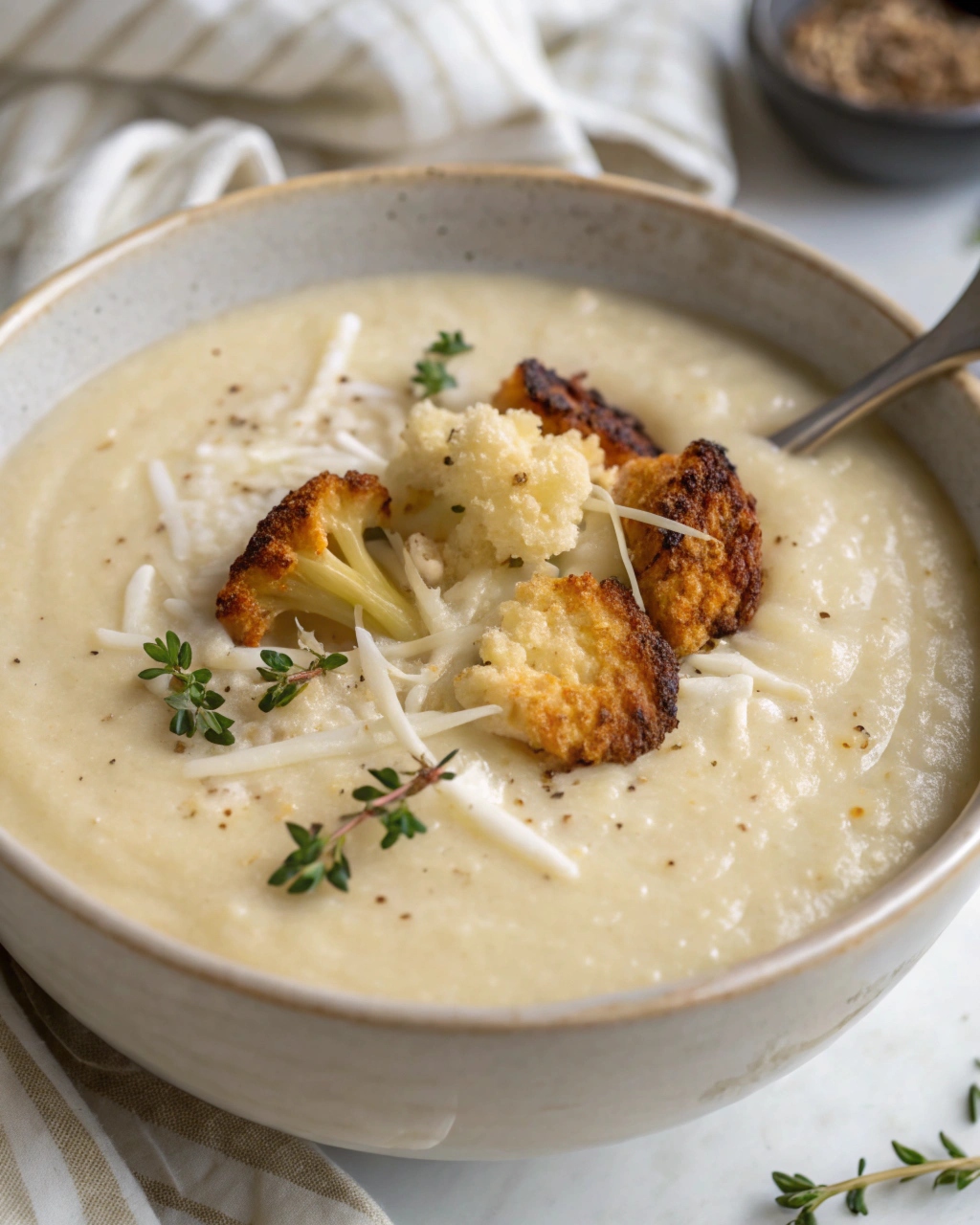 Top the soup with roasted cauliflower florets, crispy turkey bacon bits, or homemade croutons for extra texture and visual appeal.
