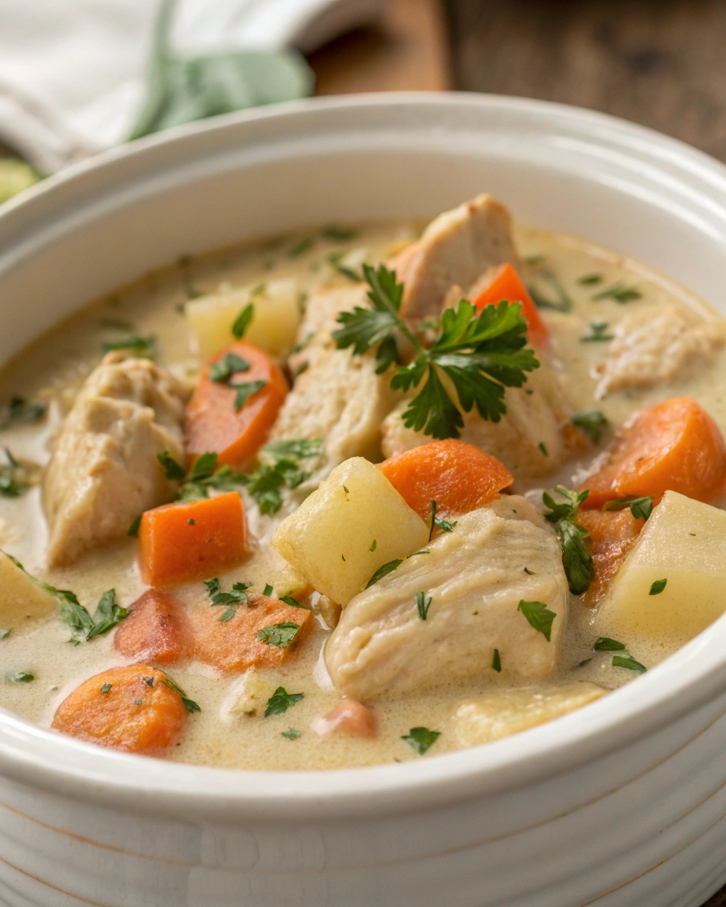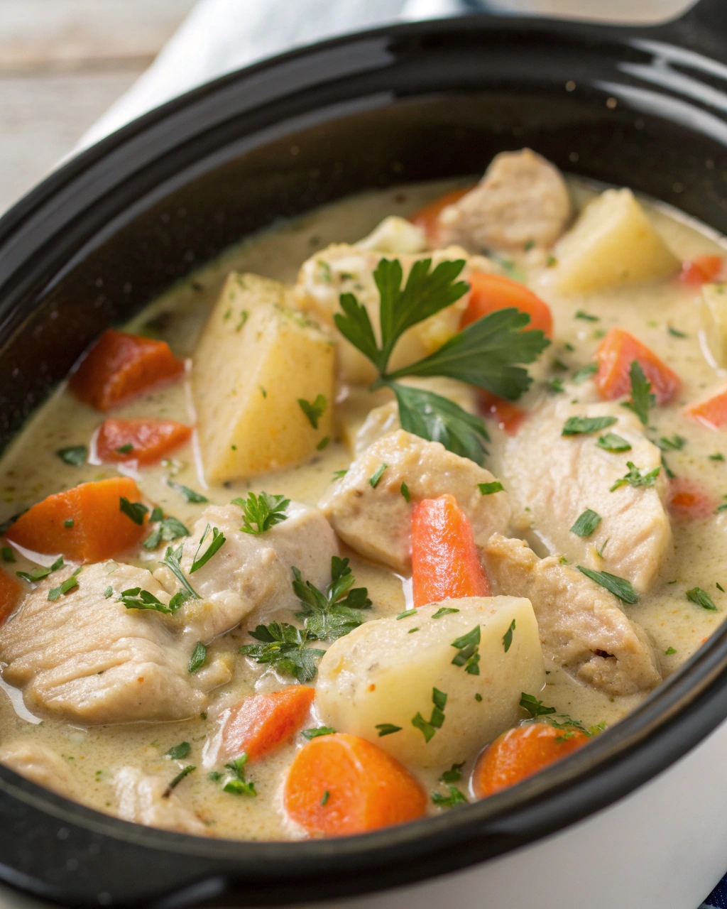 There’s something almost magical about a slow cooker meal that fills your home with the smell of comfort long before it’s ready. This Crock Pot Creamy Chicken Stew is exactly that kind of recipe — the kind that makes the kitchen smell like warmth itself. It’s the definition of slow, simple, and satisfying cooking: tender chunks of chicken simmering for hours with potatoes, carrots, and herbs in a creamy, flavorful sauce.