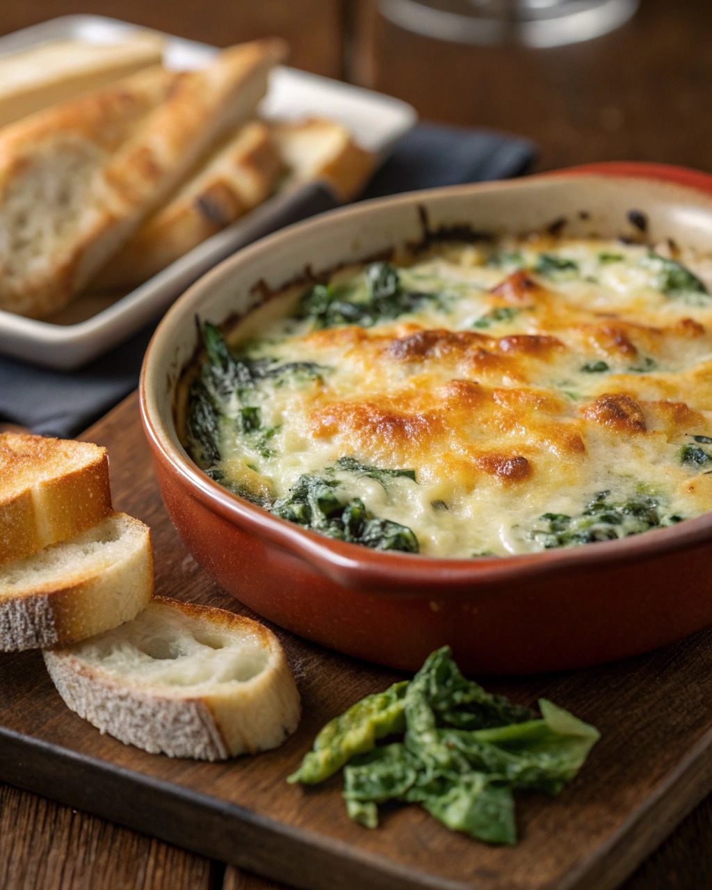 A warm creamy dip featuring spinach, artichokes, garlic, cream cheese, sour cream or Greek yogurt, mozzarella, and Parmesan—baked until bubbly and golden. Perfect with bread, crackers, or veggies.