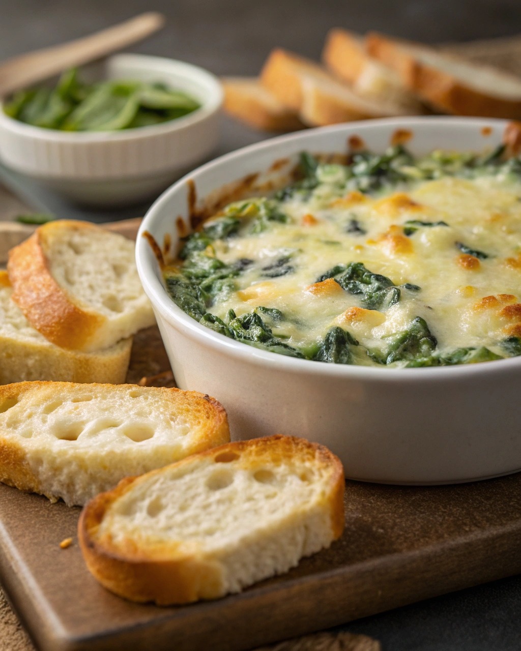 A warm creamy dip featuring spinach, artichokes, garlic, cream cheese, sour cream or Greek yogurt, mozzarella, and Parmesan—baked until bubbly and golden. Perfect with bread, crackers, or veggies.