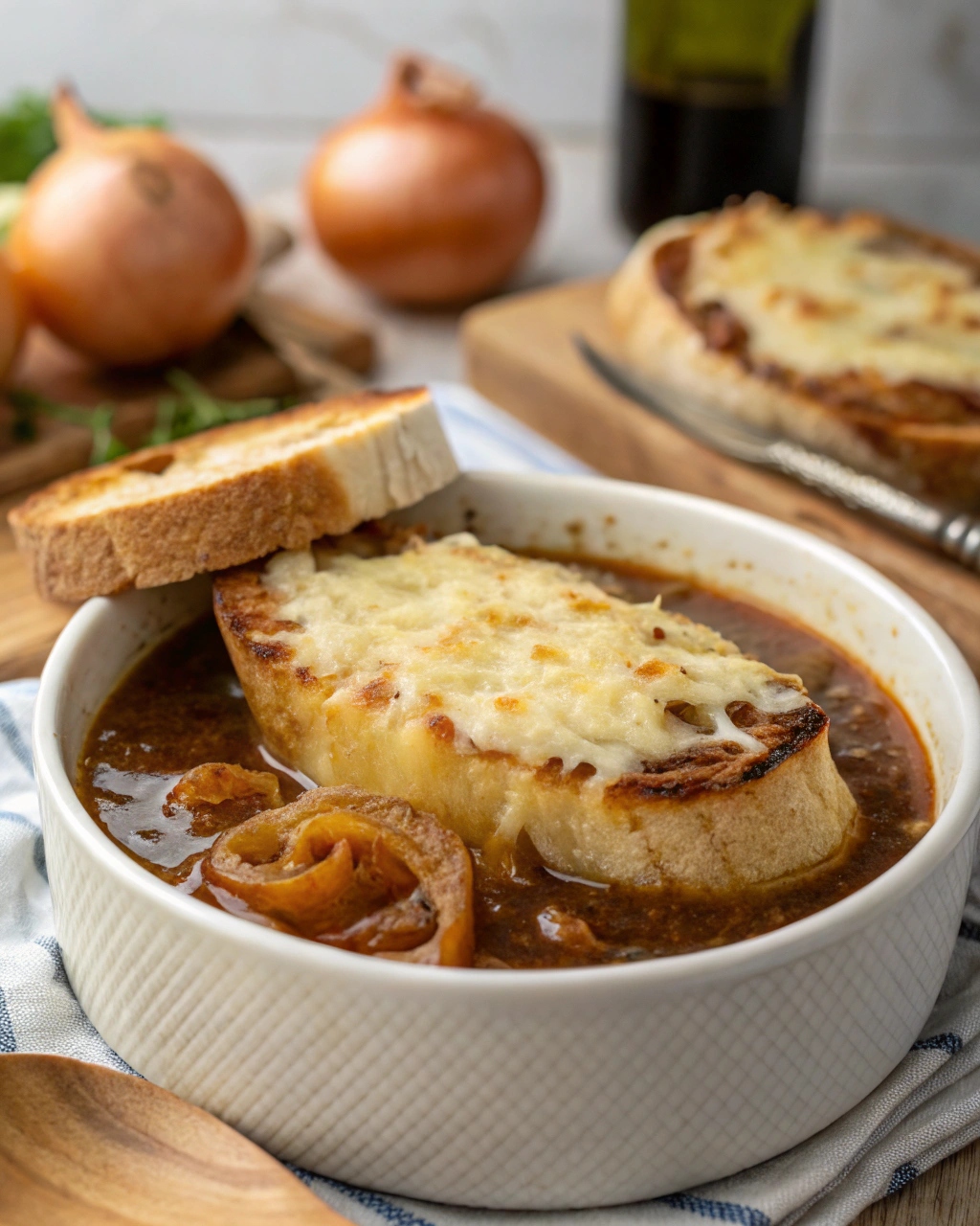 The bread topping is another essential part of the experience. A crisp baguette slice absorbs some of the broth while staying sturdy enough to support melty cheese. The contrast of toasted bread, gooey cheese, and rich broth is what makes every spoonful special.