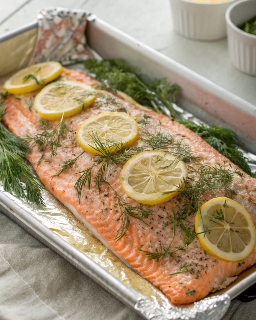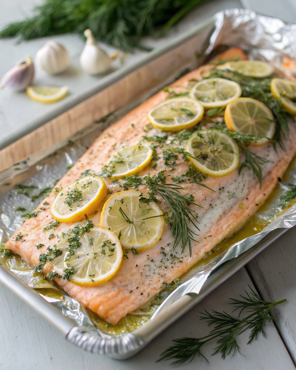 This Garlic-Butter Baked Salmon is built around fresh, vibrant flavors that highlight the natural richness of the fish. The combination of garlic and butter creates a silky, aromatic base that melts directly into the fillet as it cooks. Fresh dill adds a bright herbaceous note that cuts through the richness, while thinly sliced lemons lend their clean citrus fragrance to every bite.