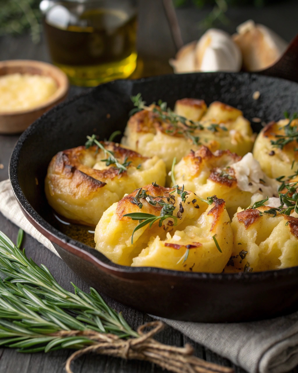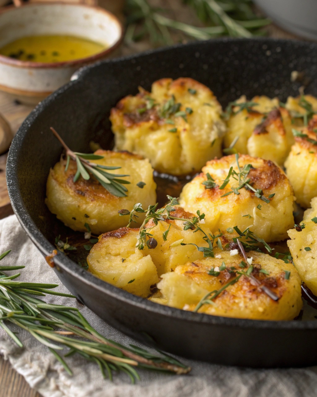 Instead of roasting, these potatoes are first simmered in a flavorful broth with rosemary and thyme. This step infuses them with herby depth from the inside out.