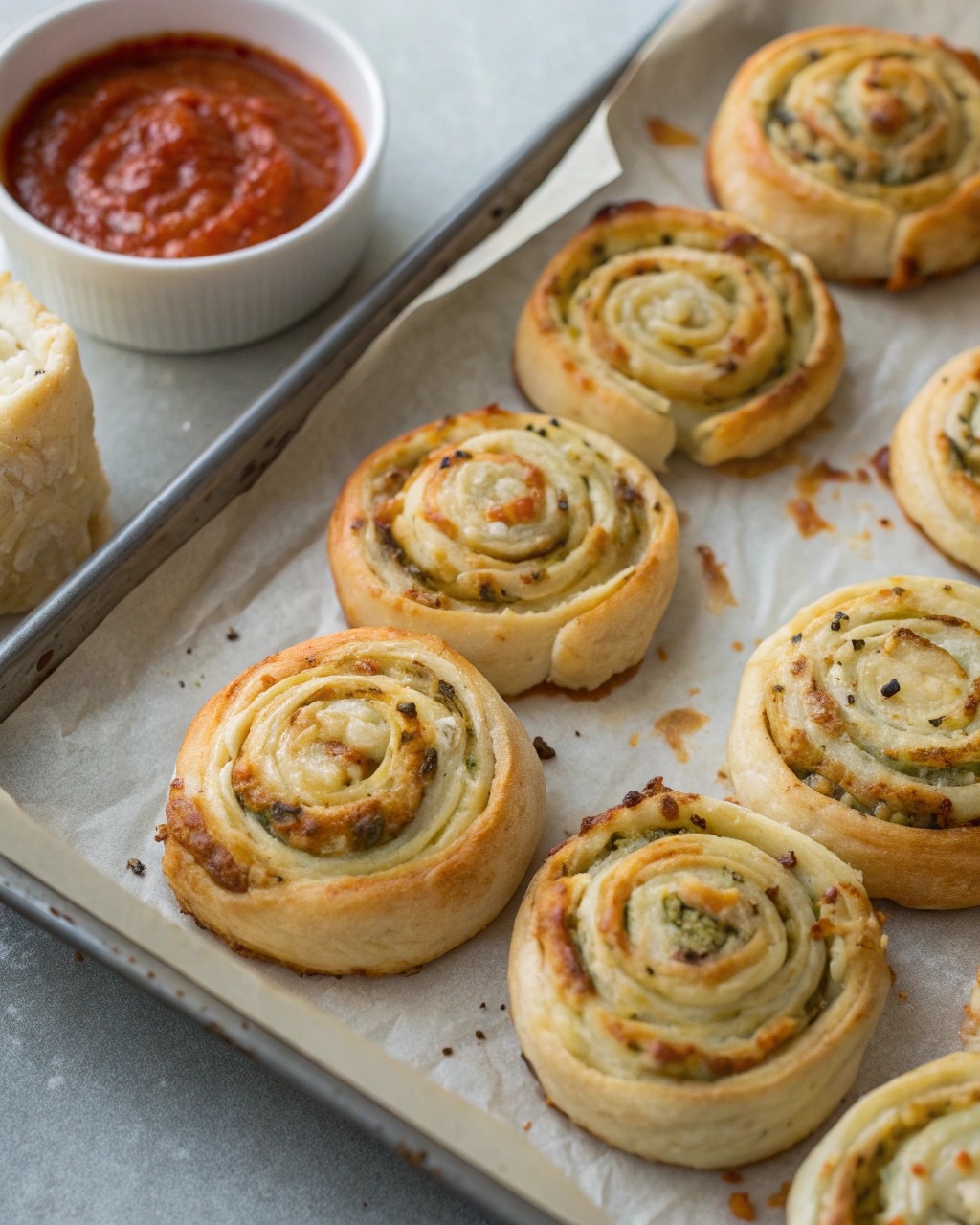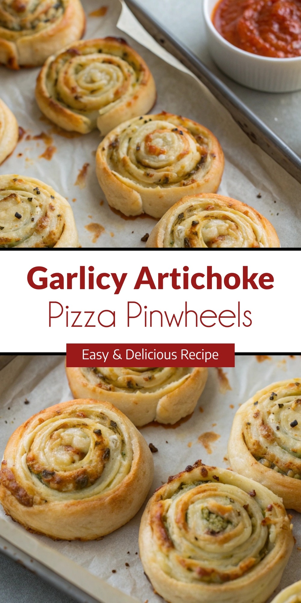 Savory pinwheels filled with roasted garlic, artichoke hearts, cream cheese, Greek yogurt, and shredded cheese—rolled, sliced, baked, and served with pizza sauce.