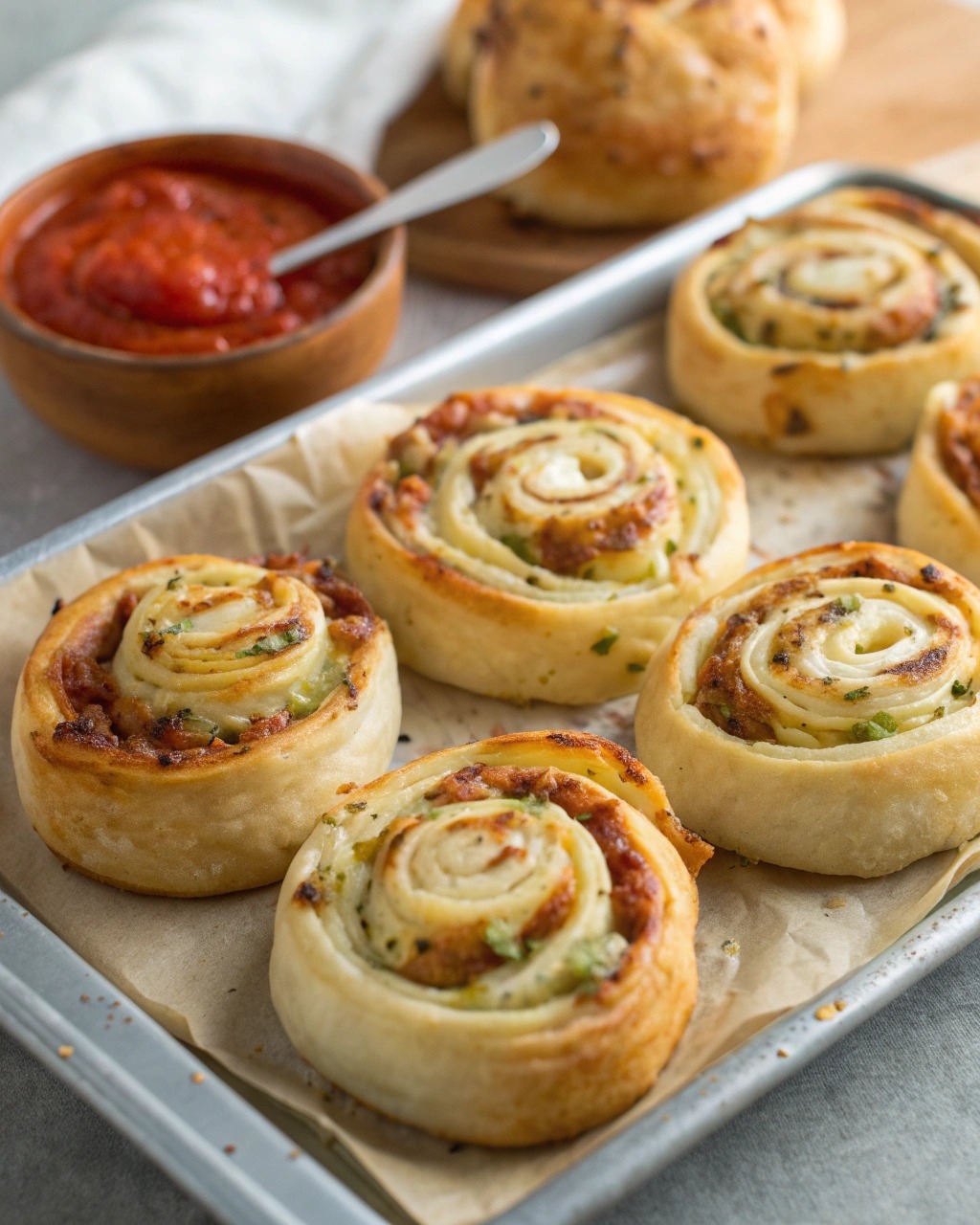 Savory pinwheels filled with roasted garlic, artichoke hearts, cream cheese, Greek yogurt, and shredded cheese—rolled, sliced, baked, and served with pizza sauce.