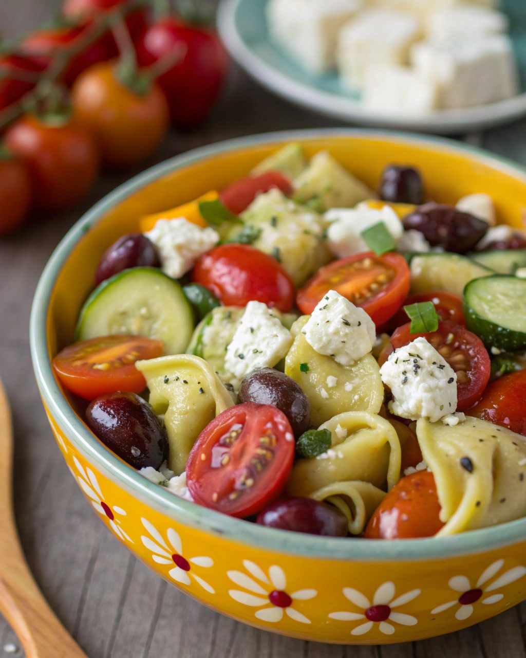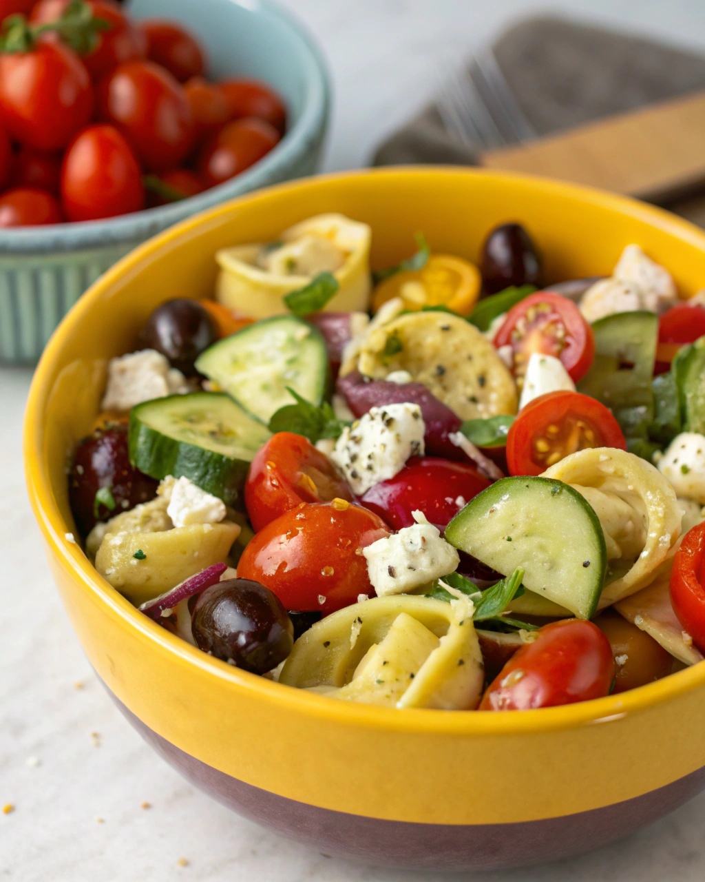 At the core of this salad are classic Greek ingredients—juicy tomatoes, crisp cucumbers, salty olives, tangy feta, and bold red onions. These ingredients each bring a unique texture and flavor that, when combined, create balance in every bite. Adding tortellini enhances the salad by giving it substance and a delightful chew that complements the crisp vegetables beautifully.