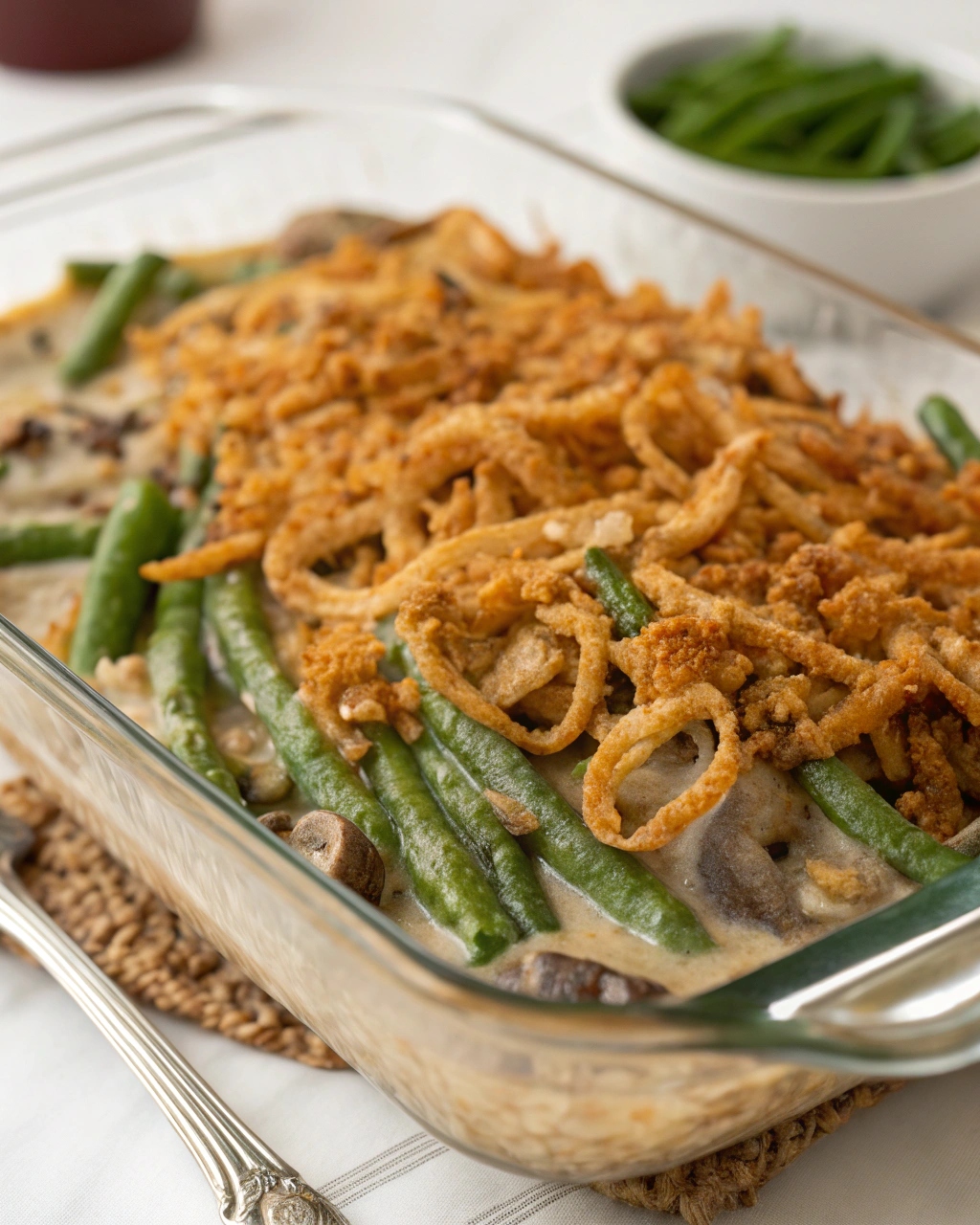 Texture is key in a great green bean casserole, and the French fried onions deliver the perfect crunch. That golden, crispy layer on top contrasts beautifully with the rich sauce below — it’s what makes every spoonful irresistible.