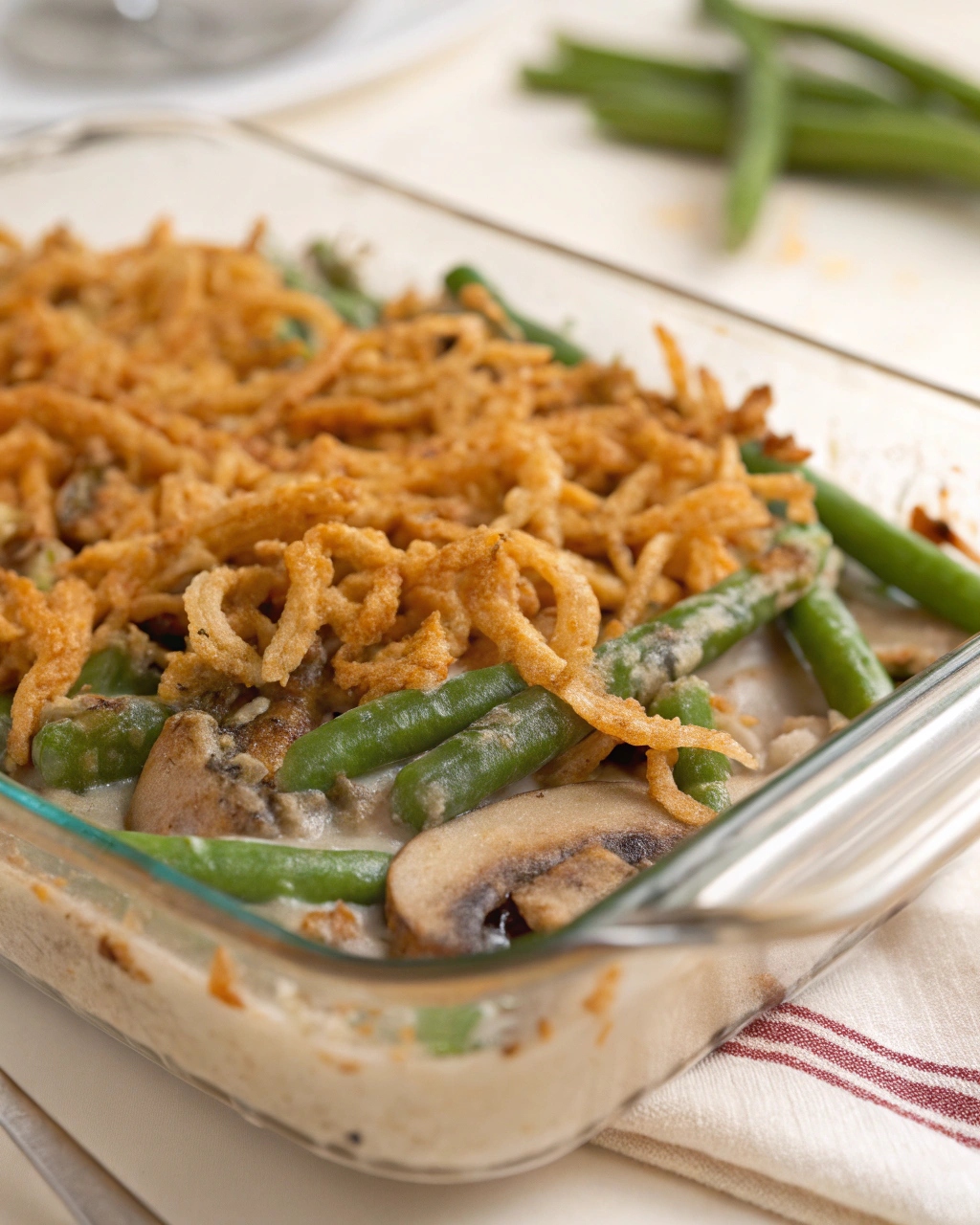 Then comes the creamy mushroom sauce — the soul of the dish. Sautéed white mushrooms, onions, and butter create a savory base. Add in milk thickened with a little cornstarch, and you get a perfectly smooth, velvety sauce that clings to every green bean. It’s lighter than traditional versions but still incredibly satisfying.